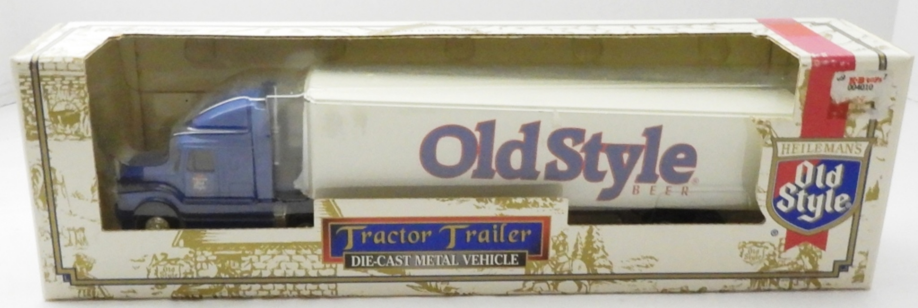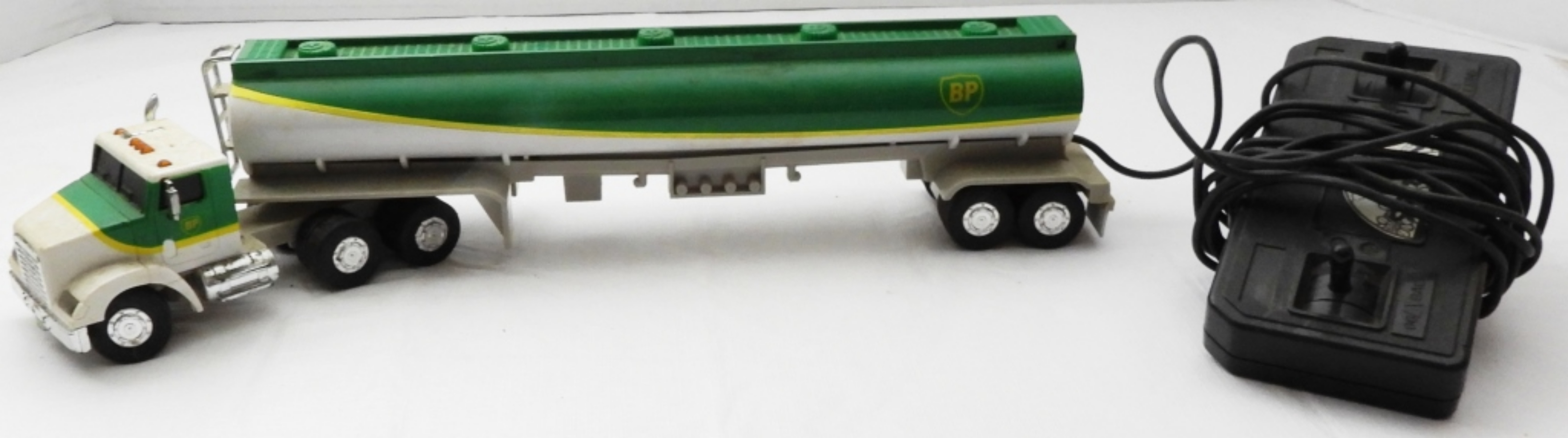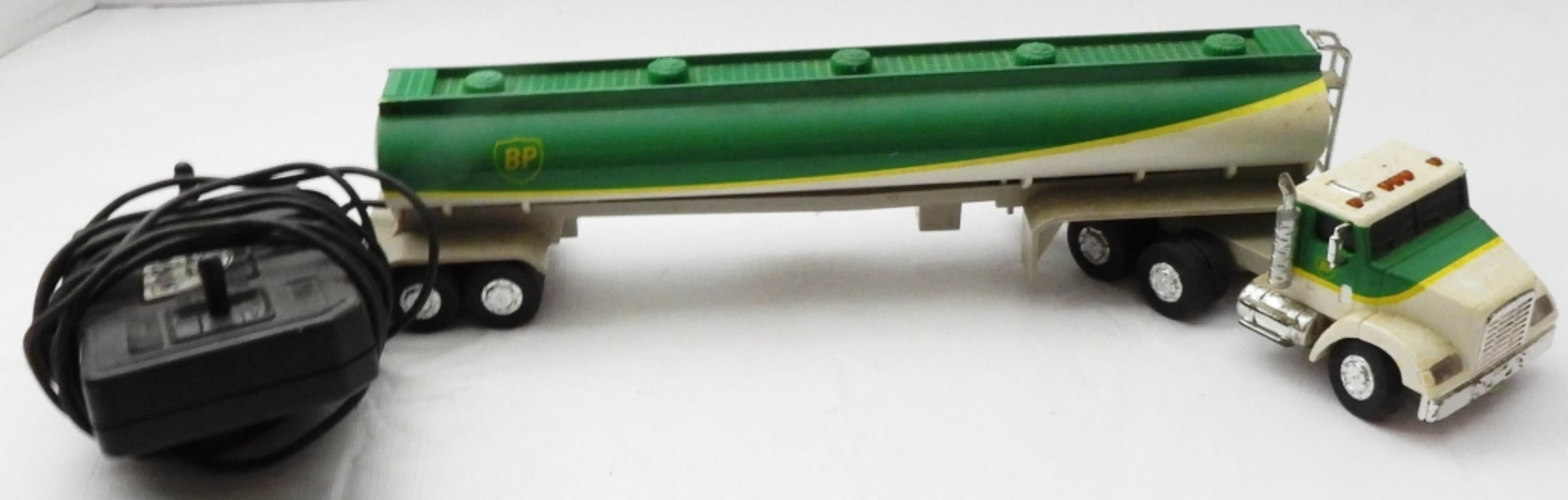 Marathon semi in great condition, in original box, 16″ long, Old Style Beer Tractor Trailer die-cast metal Heileman’s, in original box, 12″ long, and a BP remote control semi truck, did not work when tested,