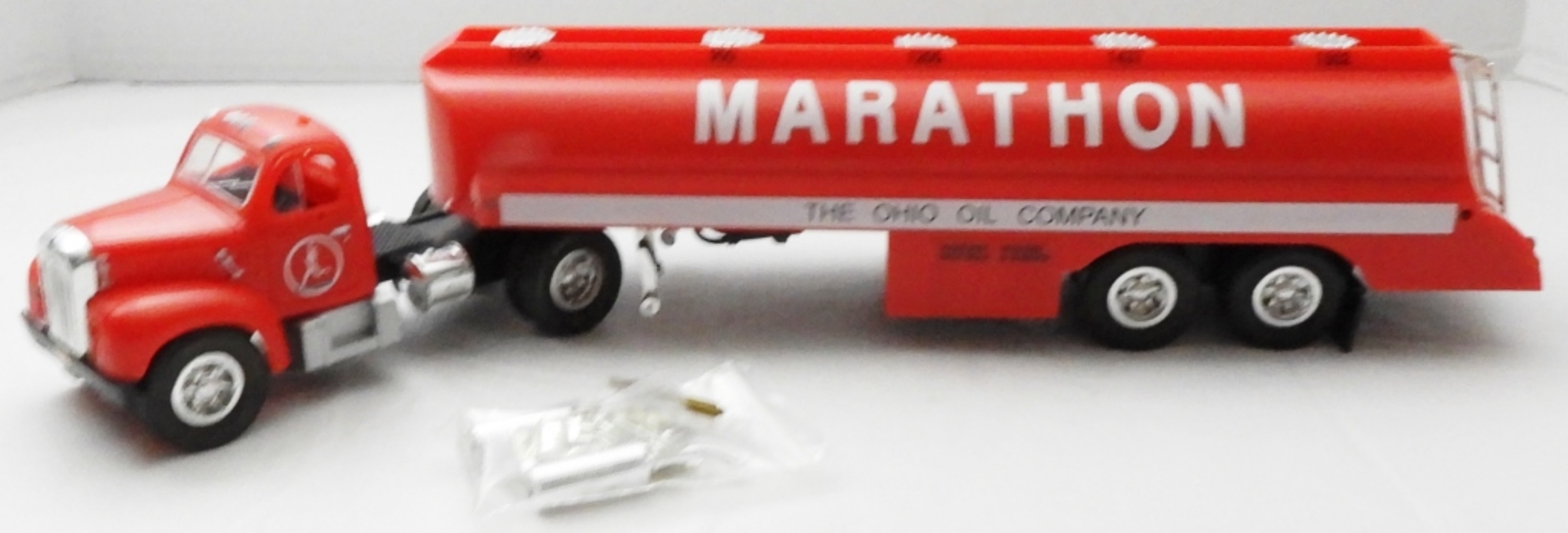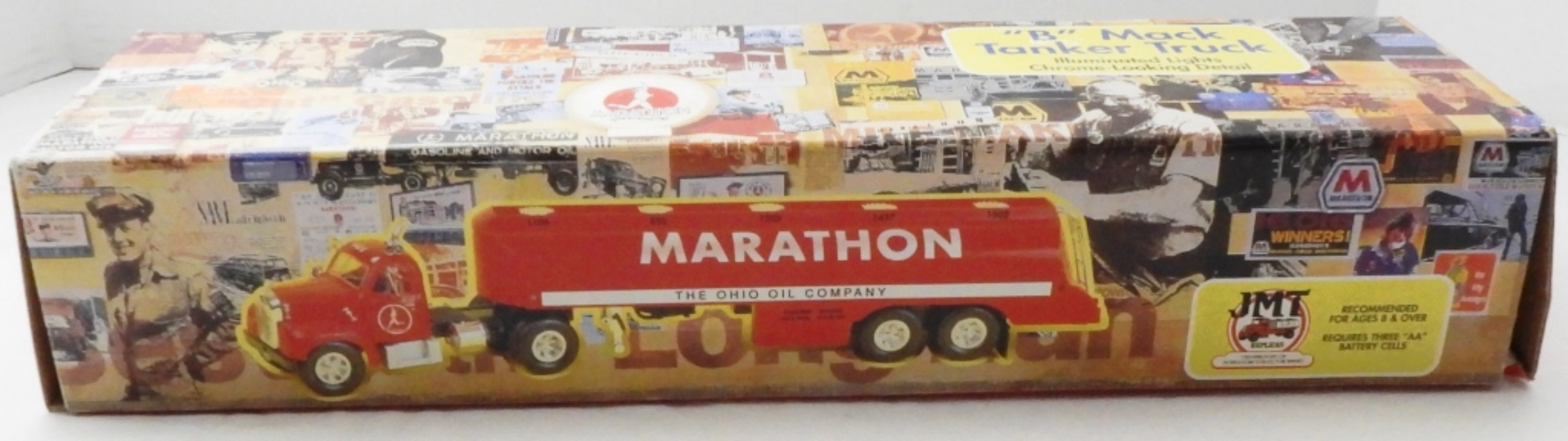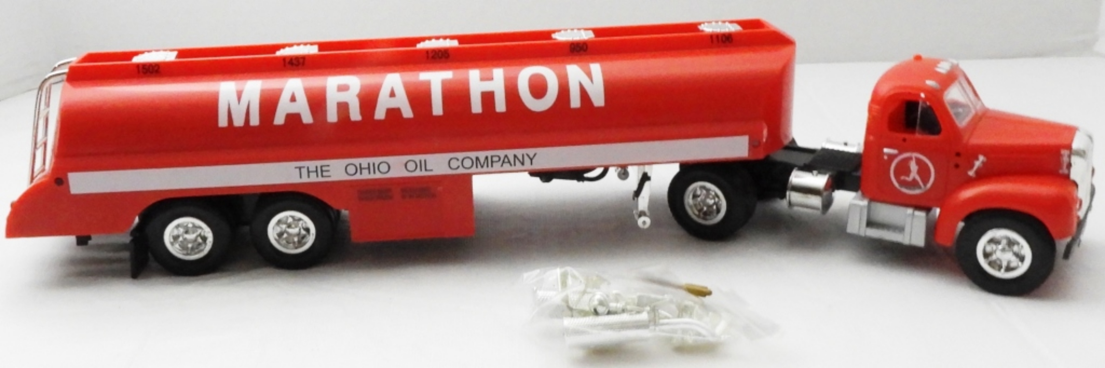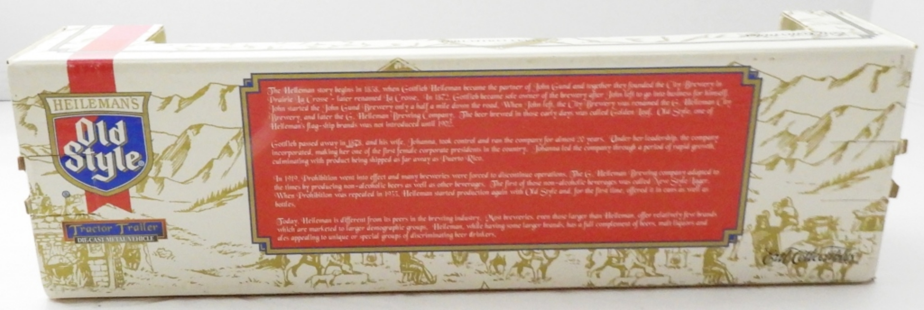 Marathon semi in great condition, in original box, 16″ long, Old Style Beer Tractor Trailer die-cast metal Heileman’s, in original box, 12″ long, and a BP remote control semi truck, did not work when tested,
