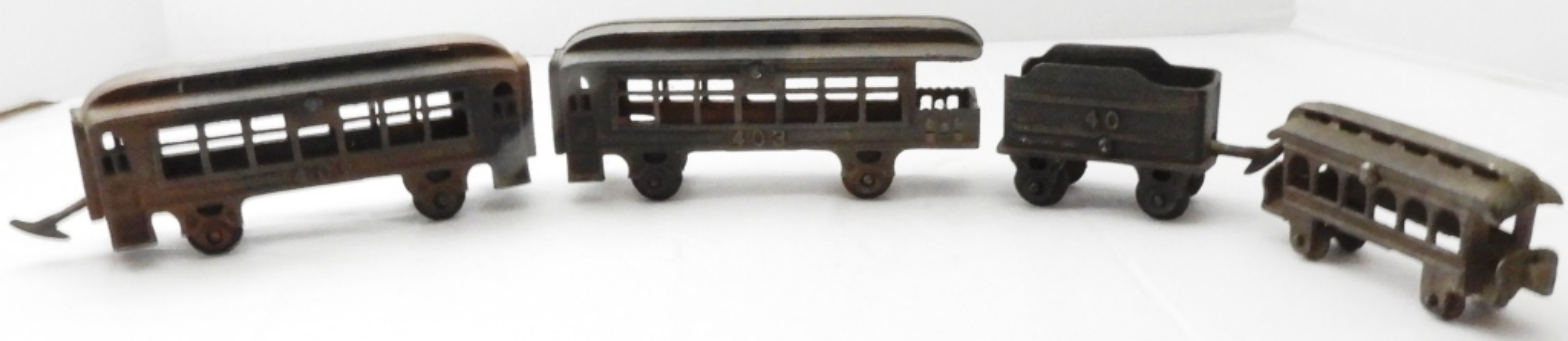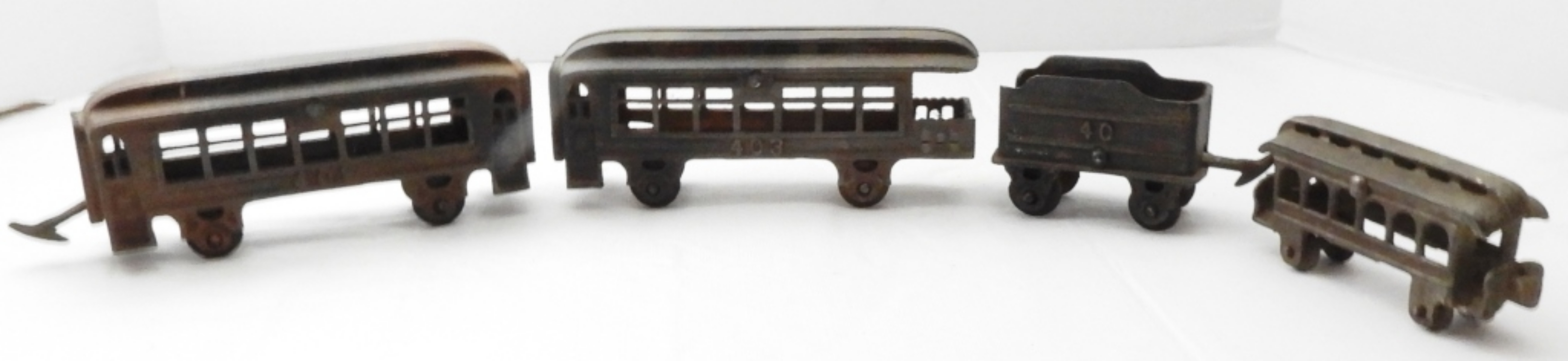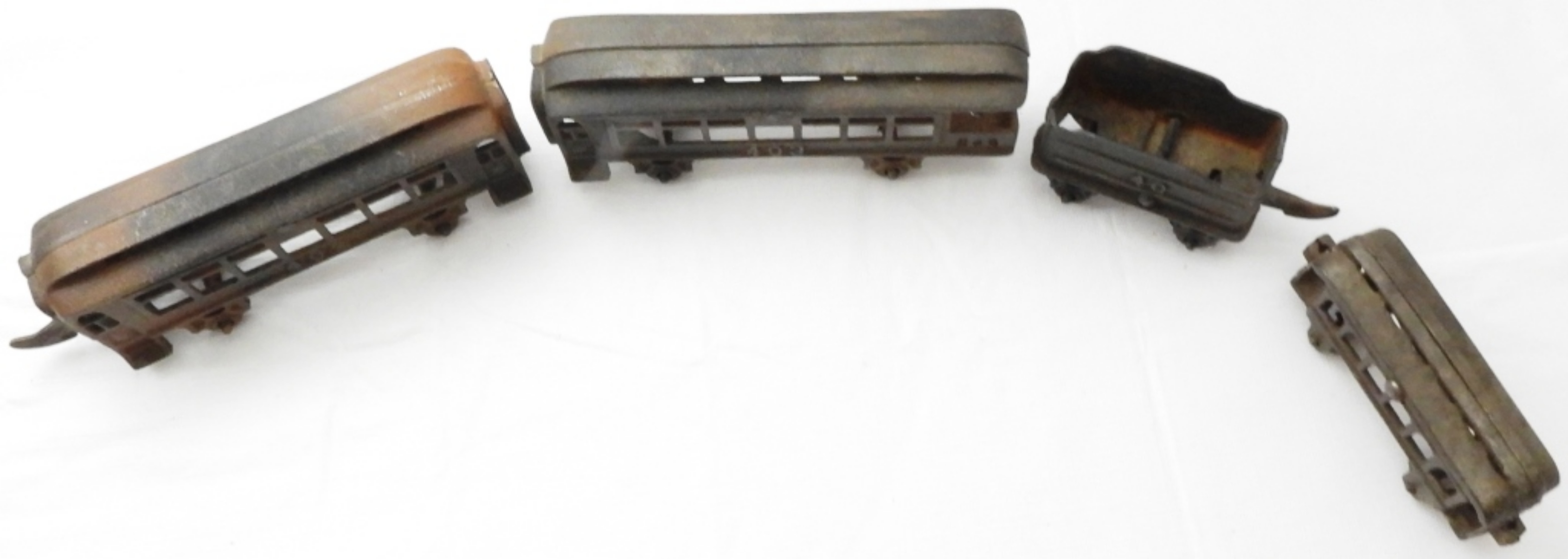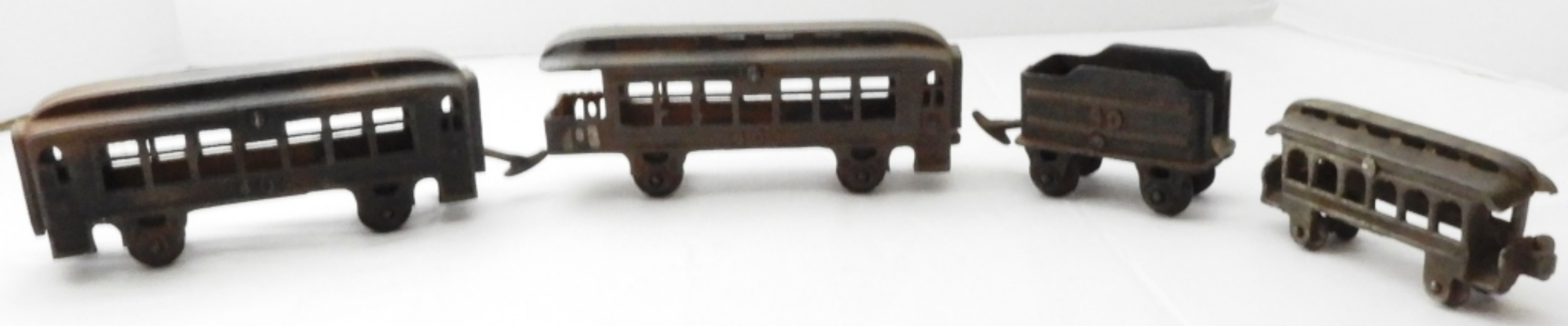 Coal tender, a caboose, and (2) passenger cars, one is smaller, some rust