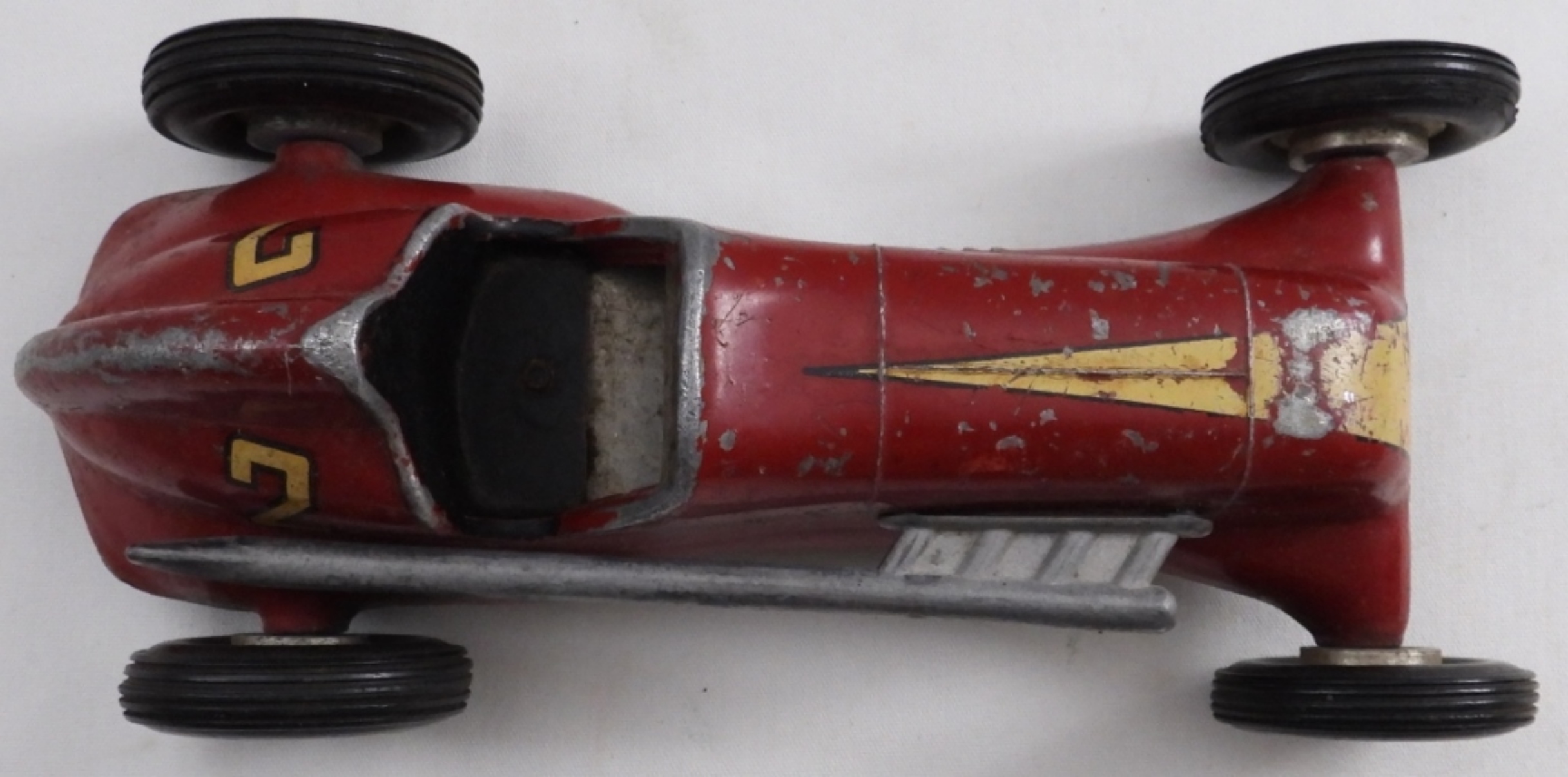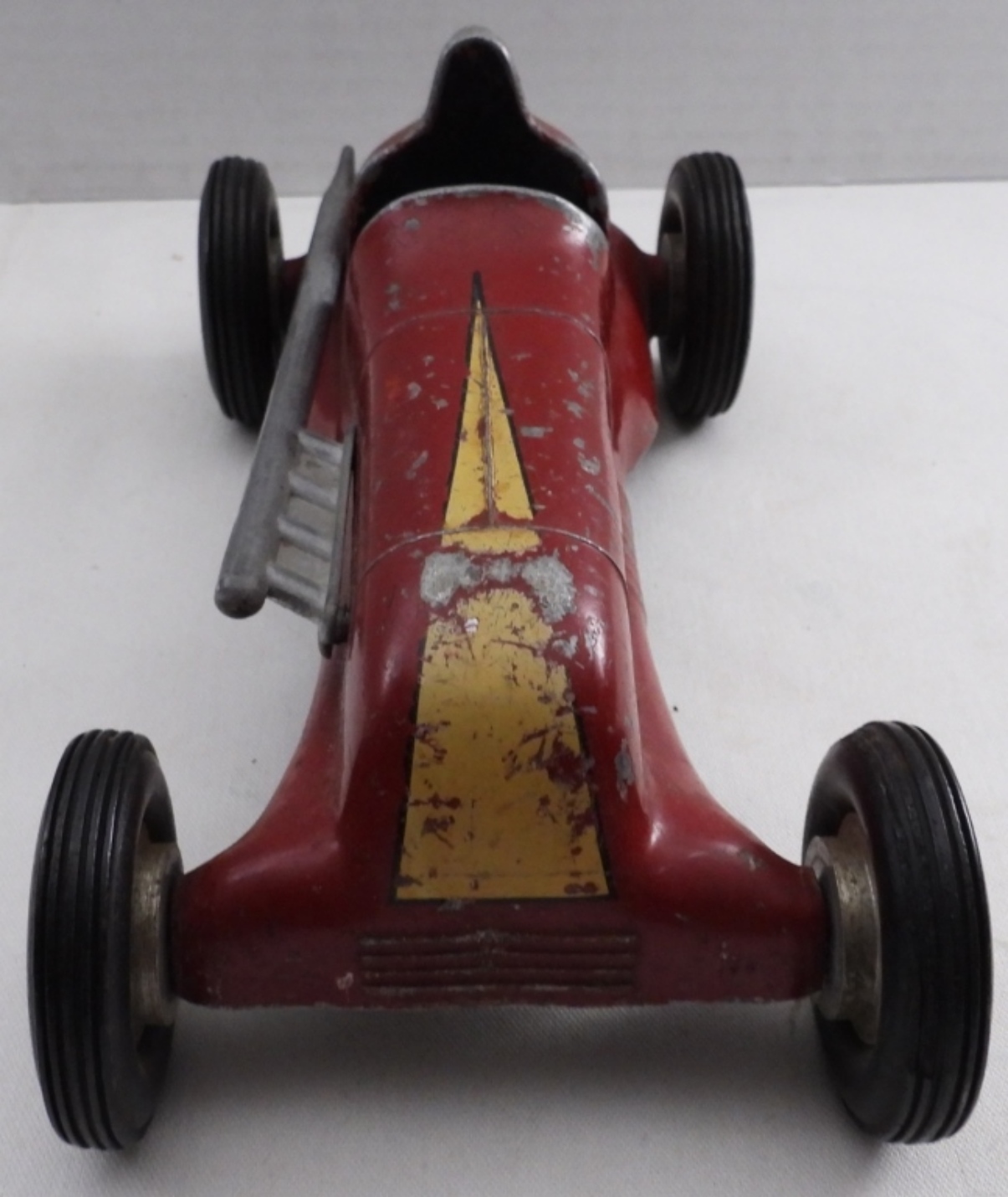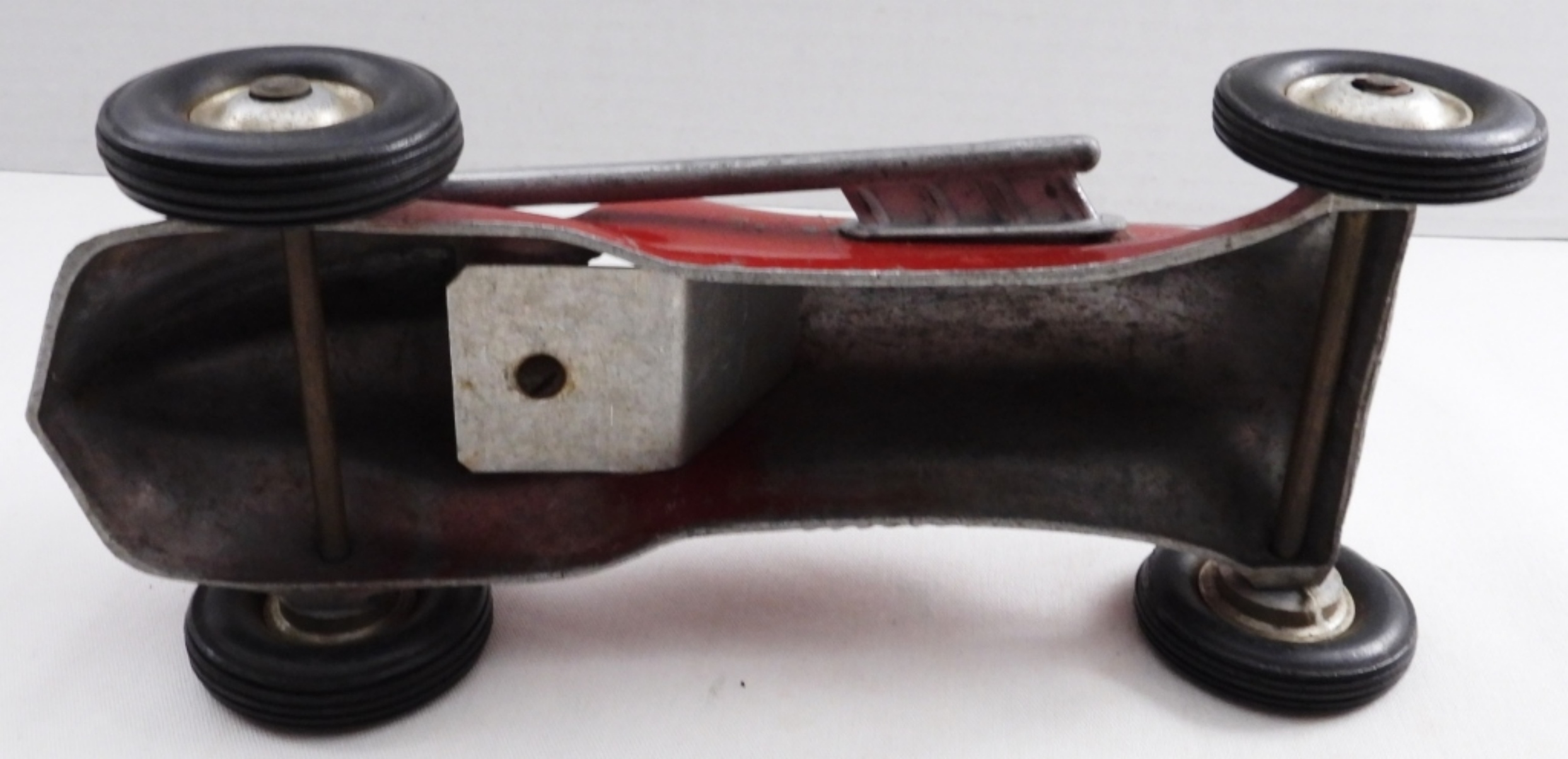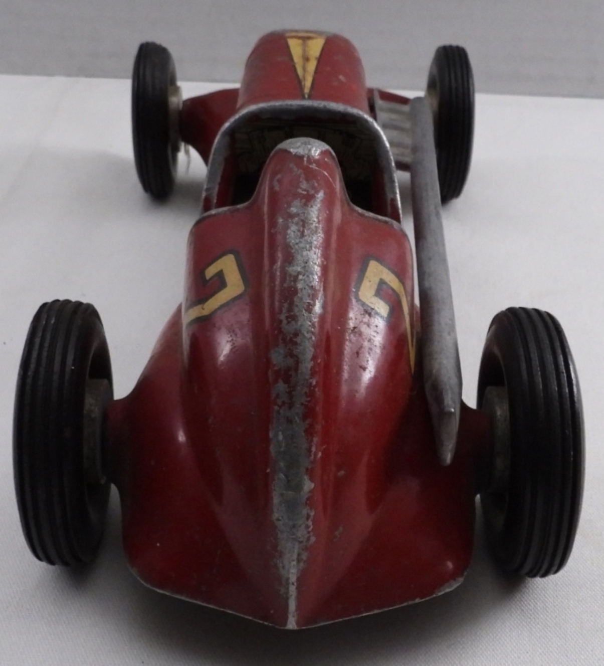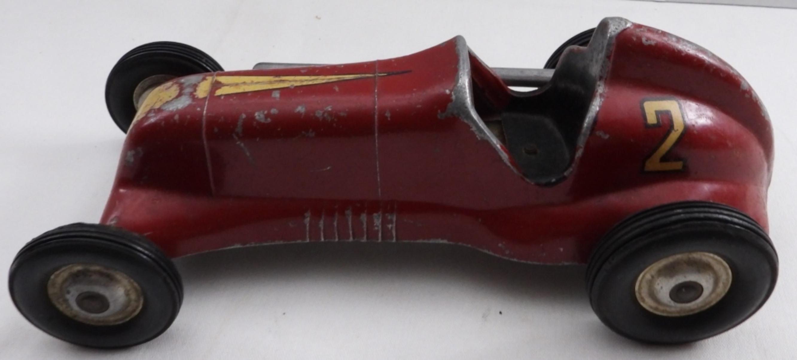 Circa 1950s, #2 red, some paint has worn off, wheels are movable, 8″ long