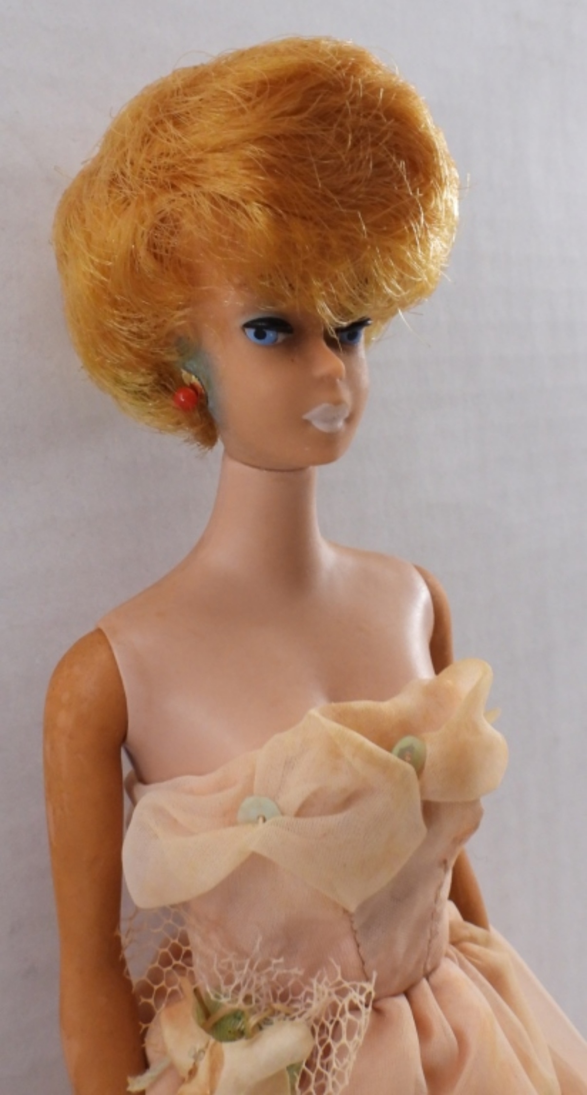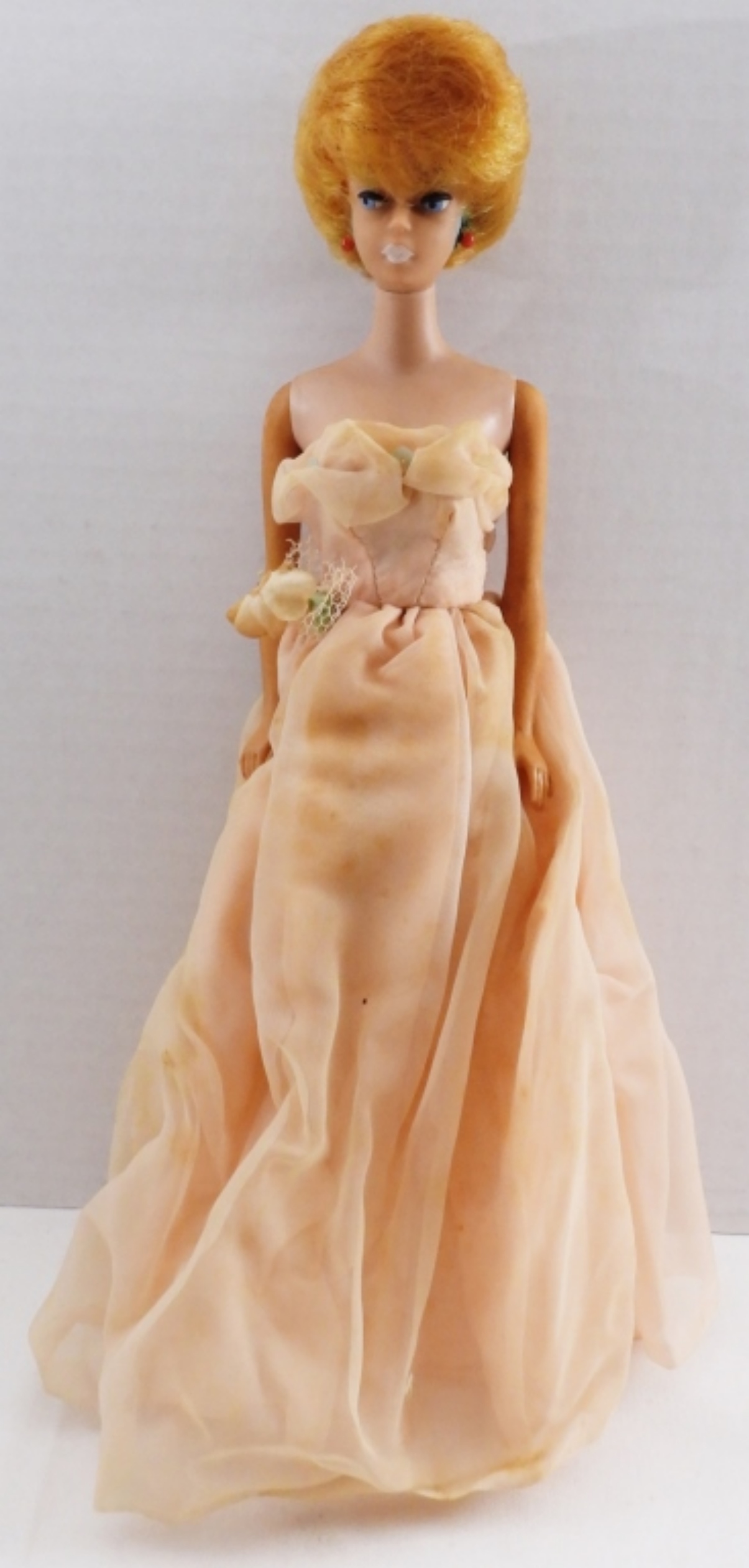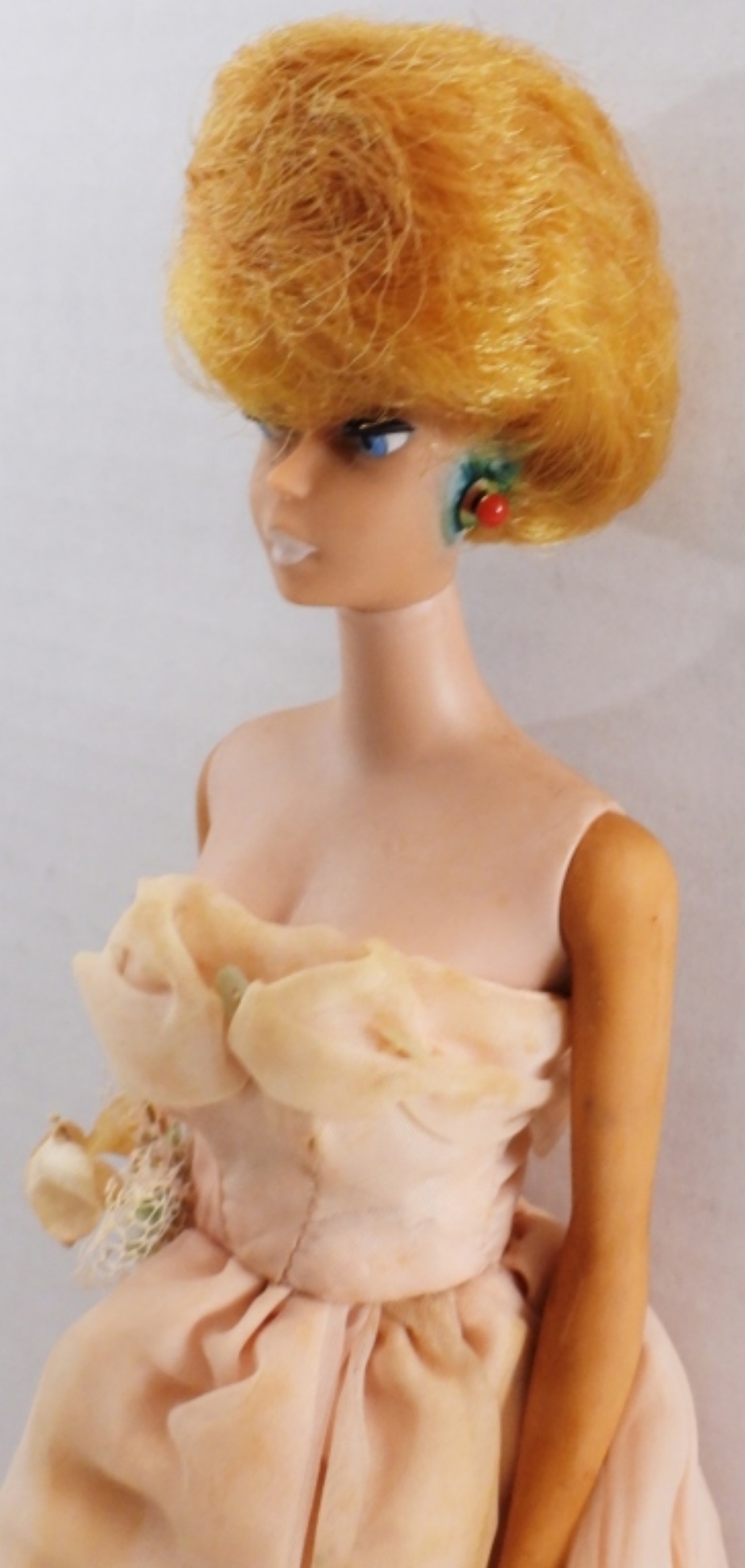 Beautiful Barbie, in a pale pink dress with pink heels ( small crack in one), box states “platinum bubble cut”, flower on dress is loose, dress is stained with time, Barbie’s ears have turned green, box in good