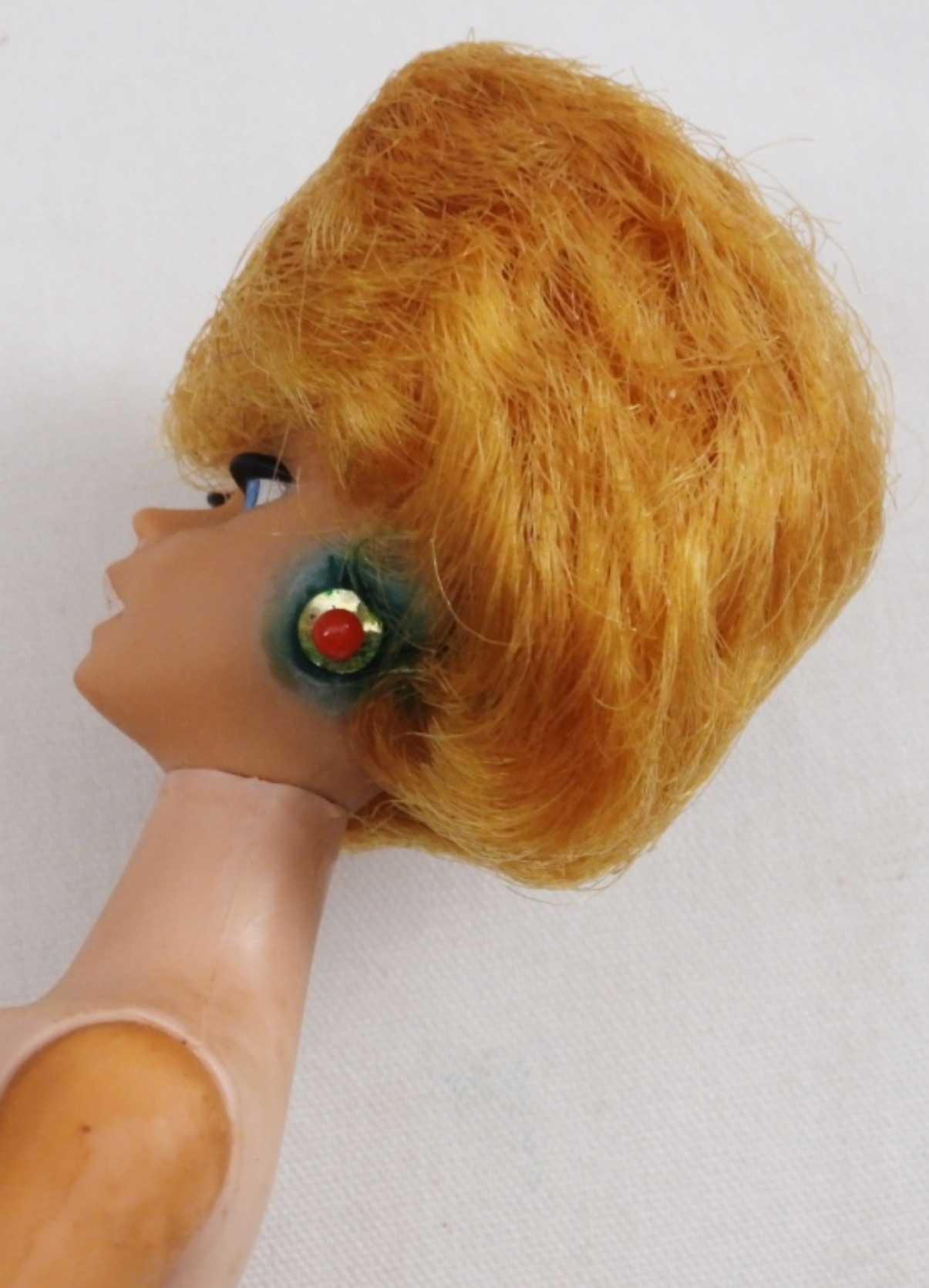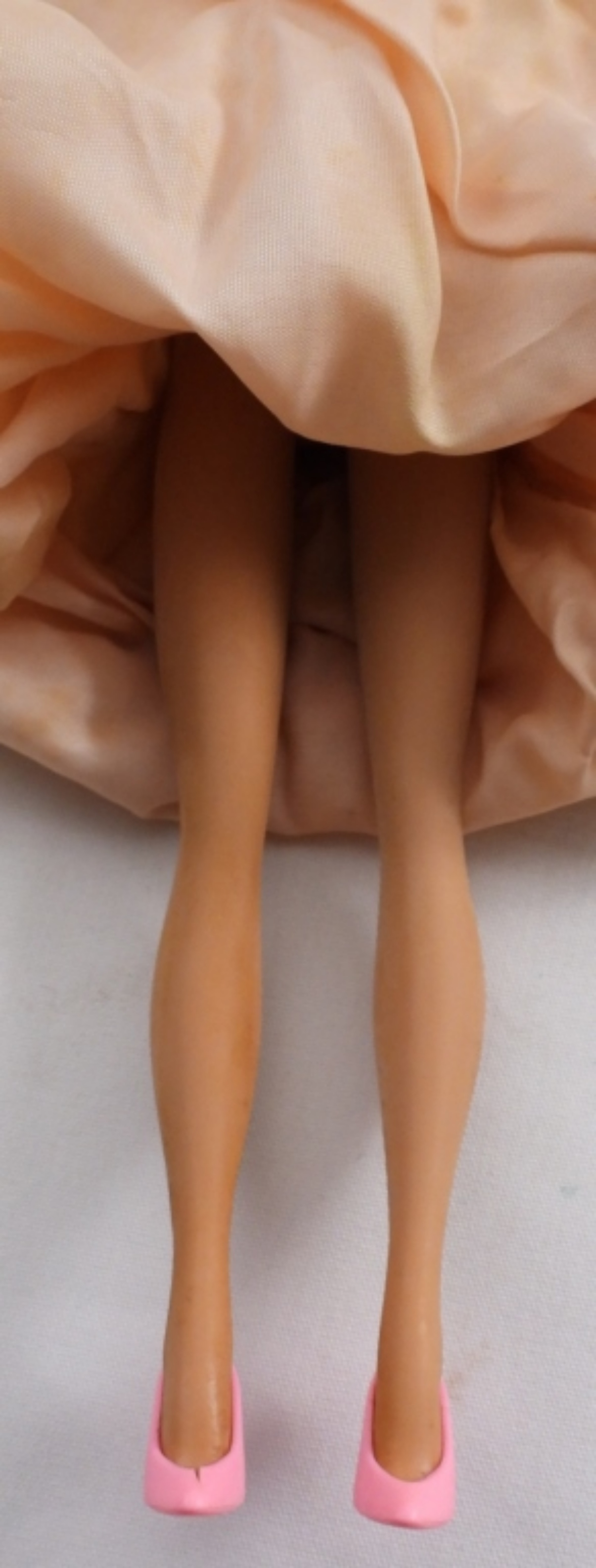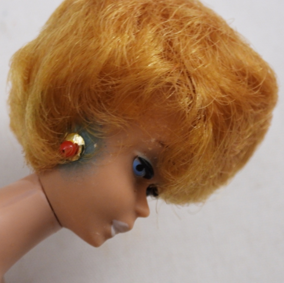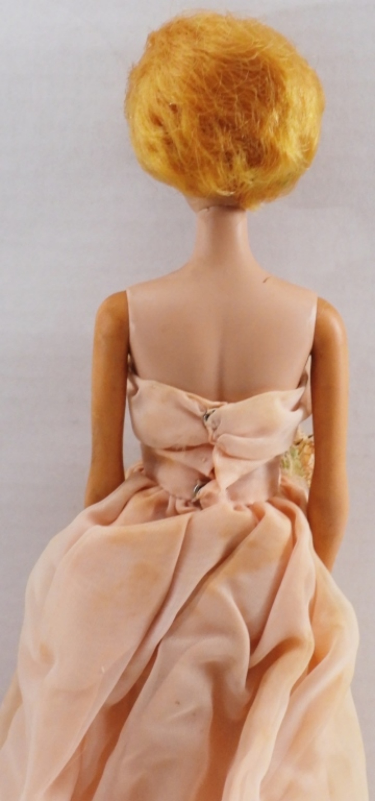 Beautiful Barbie, in a pale pink dress with pink heels ( small crack in one), box states “platinum bubble cut”, flower on dress is loose, dress is stained with time, Barbie’s ears have turned green, box in good