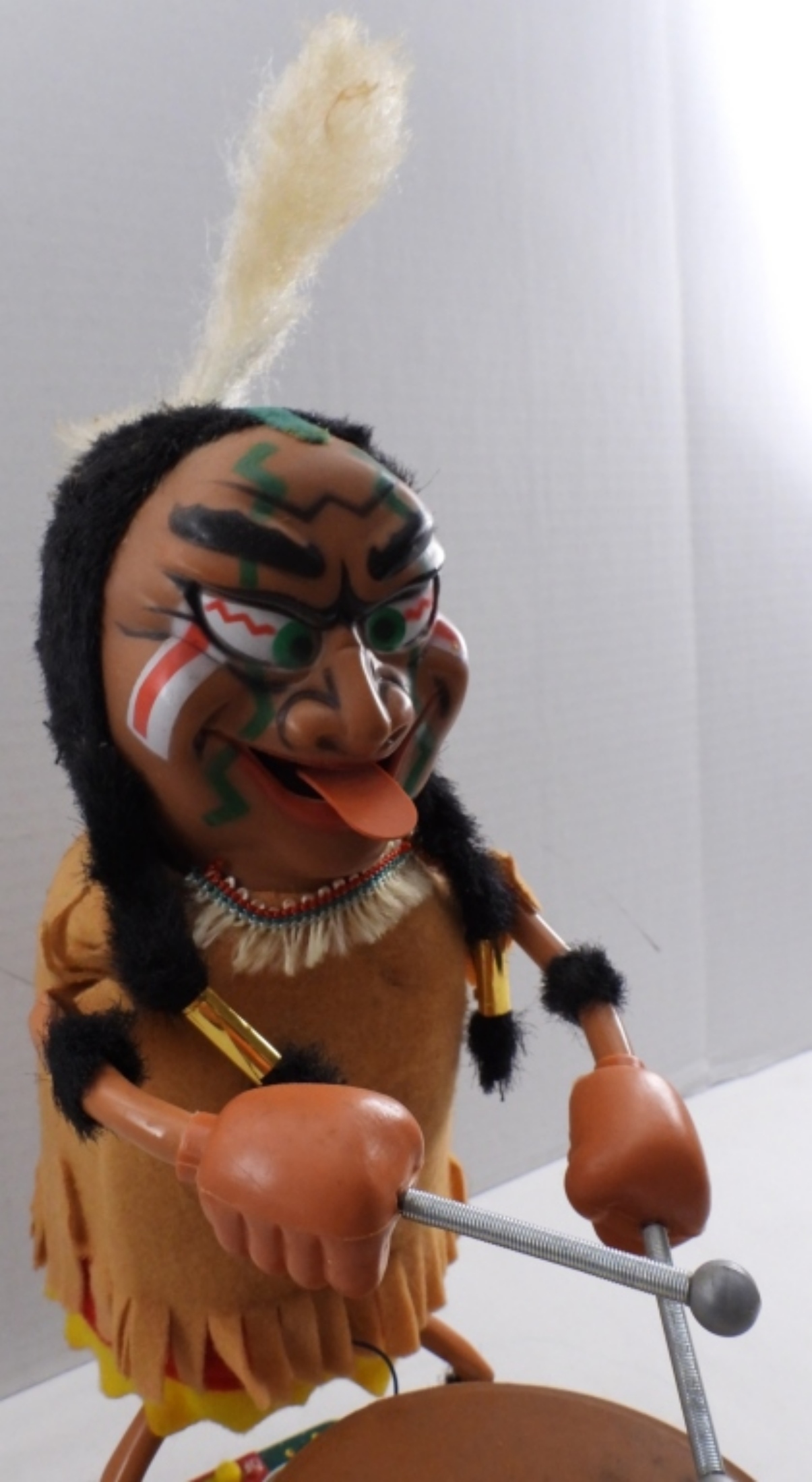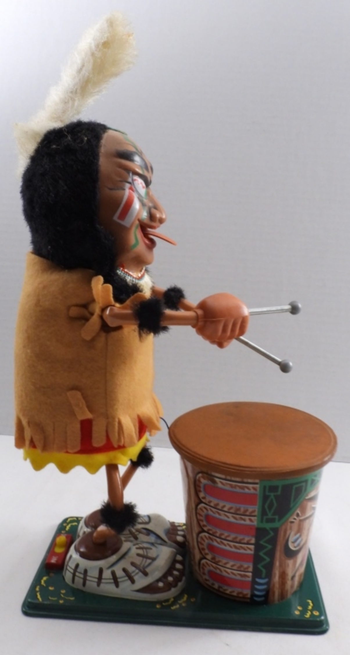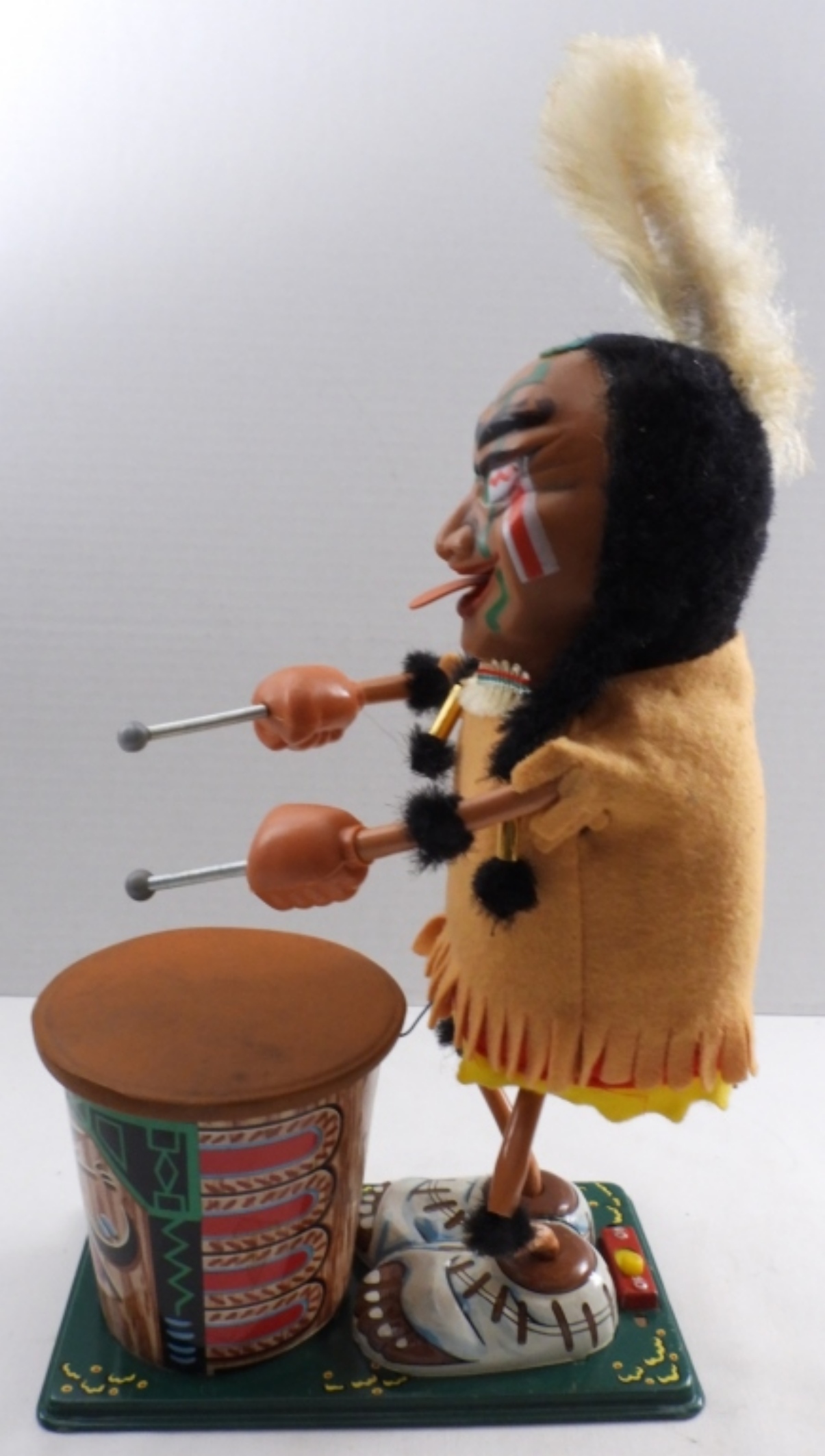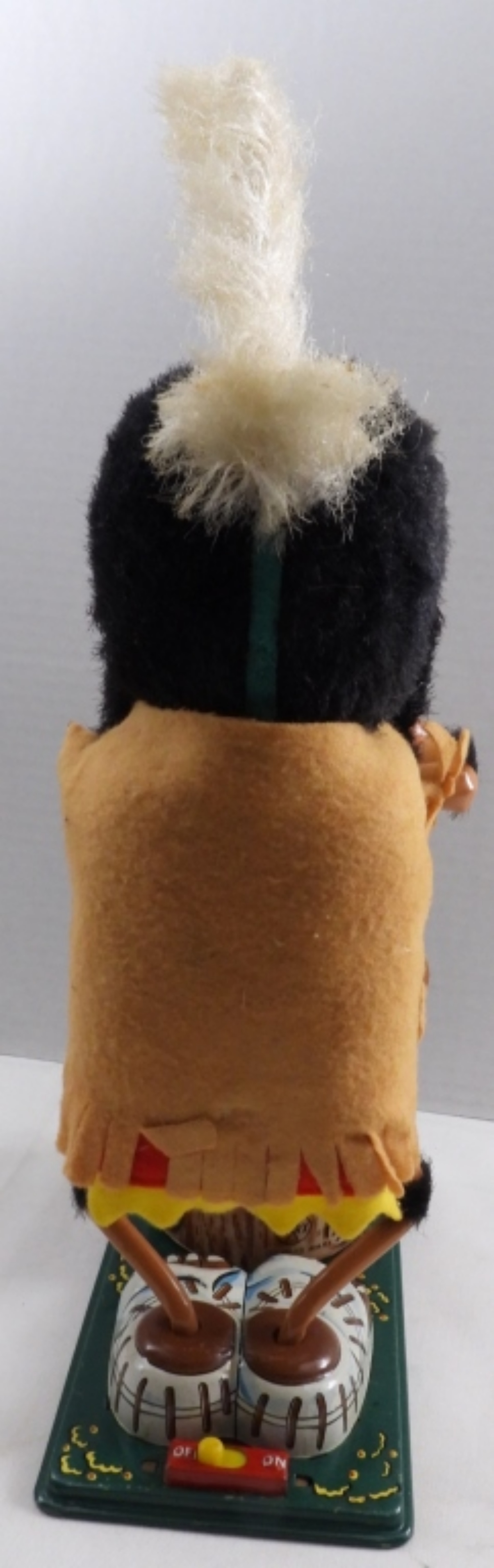 Vintage 1960s, battery-operated (put D batteries in, and it did not turn on), box is very beat up, Indian is in very good condition, some paint is worn away, colors are vibrant, feather to base 14″, base length