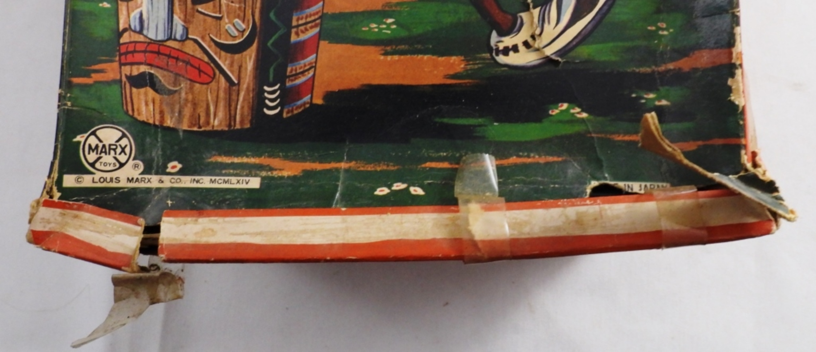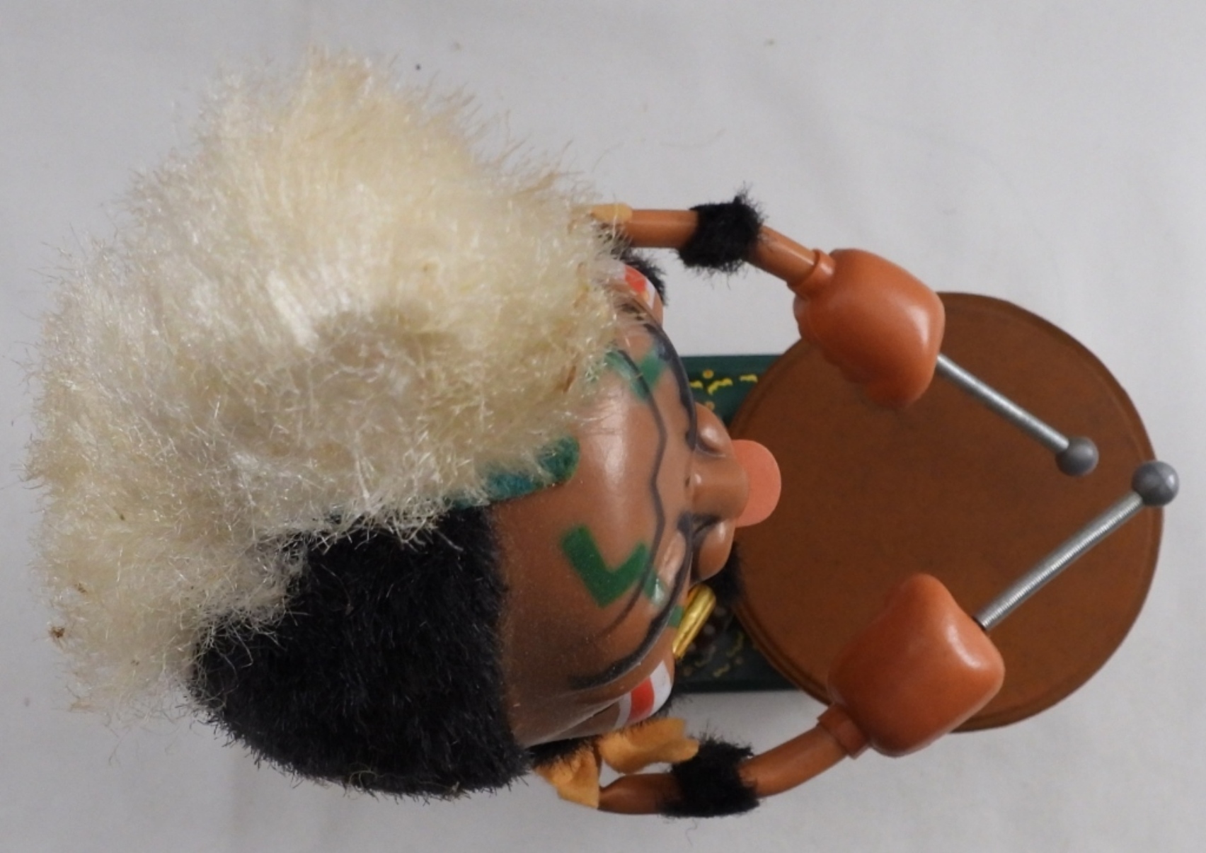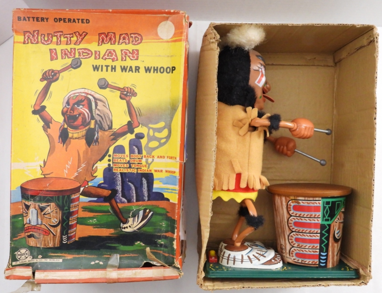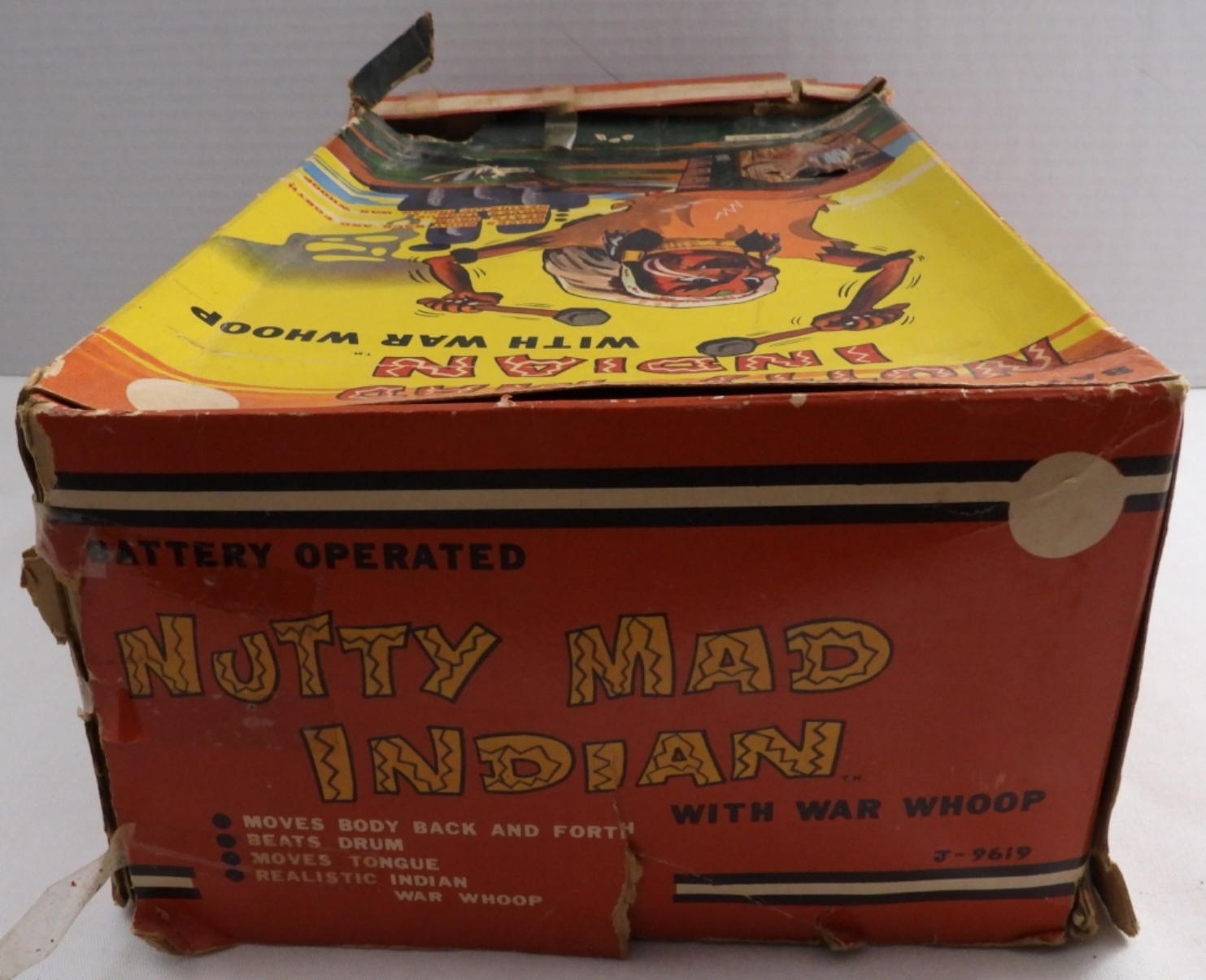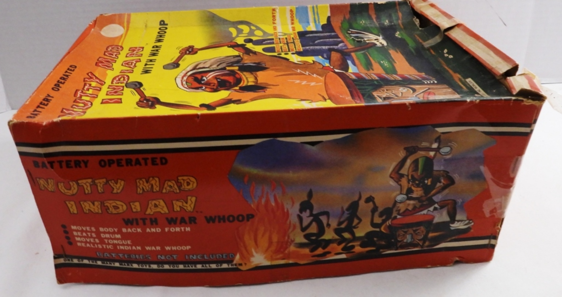 Vintage 1960s, battery-operated (put D batteries in, and it did not turn on), box is very beat up, Indian is in very good condition, some paint is worn away, colors are vibrant, feather to base 14″, base length
