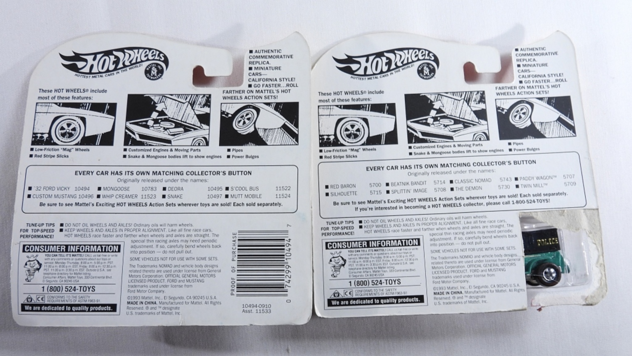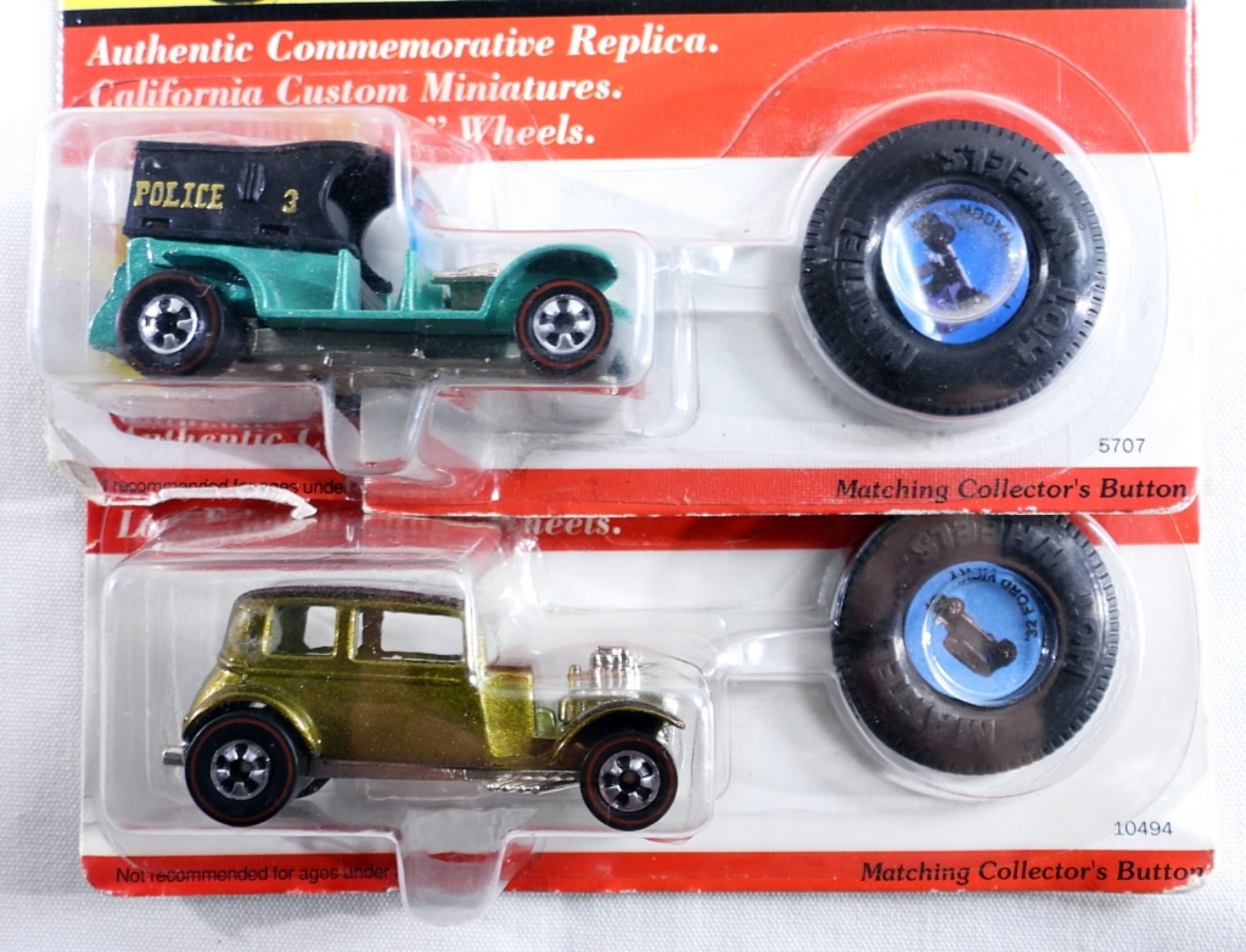Two 1993 Mattel Hot Wheels, Authentic Commemorative Replicas. Red Line Series. New In Box. ’32 Ford Vicky and Paddy Wagon. The box of the paddy wagon has the upc code cut off.