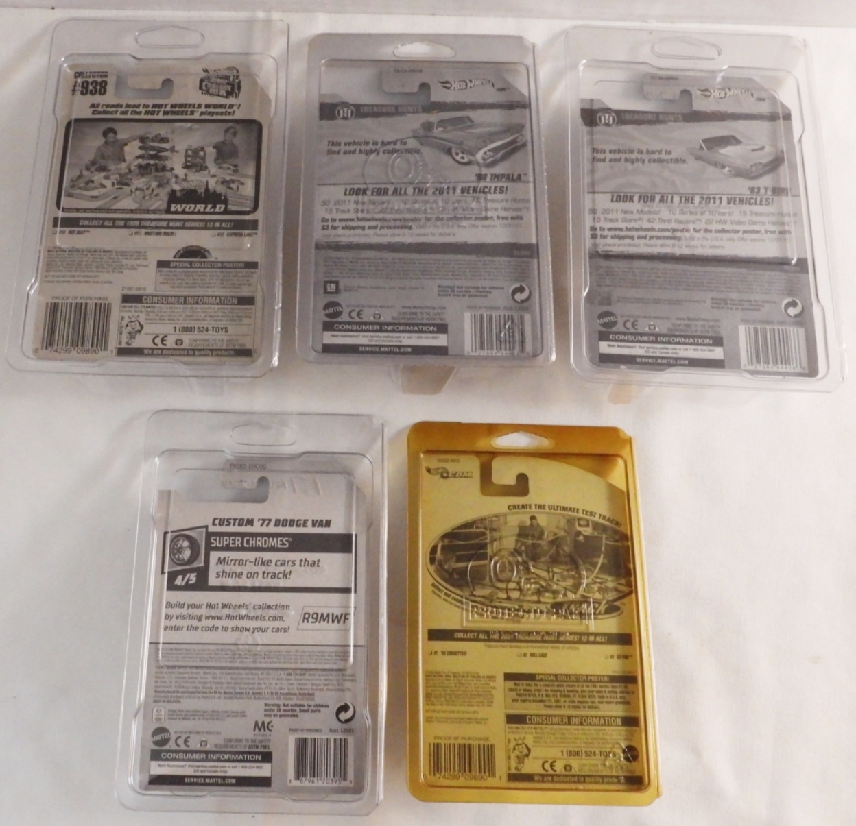 Like new in original package! 1) 1999 Treasure Hunt Series 10 of 12. 2) Super Chromes 23/250. 3) 3/15 ’58 Impala. 4) 6/15 “63 T-Bird. 5) 2001 003