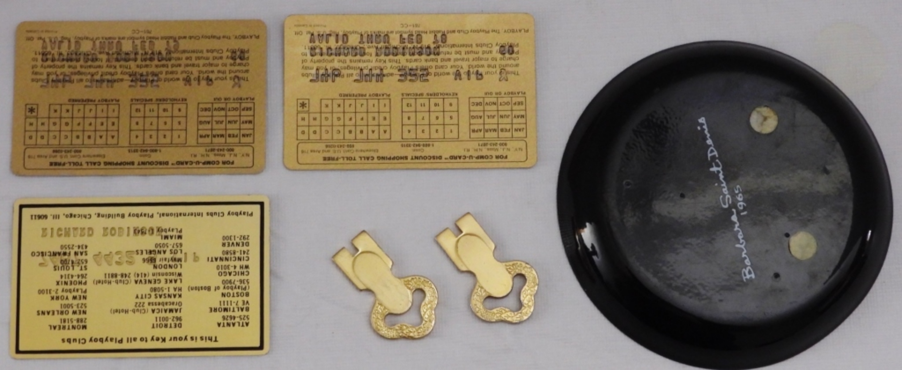 2 The Playboy Club Presidential Key 1978 & 1979 VIP. 1 The Playboy Club (key to all the Playboy Clubs), 2 small keys 887 & PL72, 1 metal Playboy astray from (on the back Barbara Saint Davis 19650)