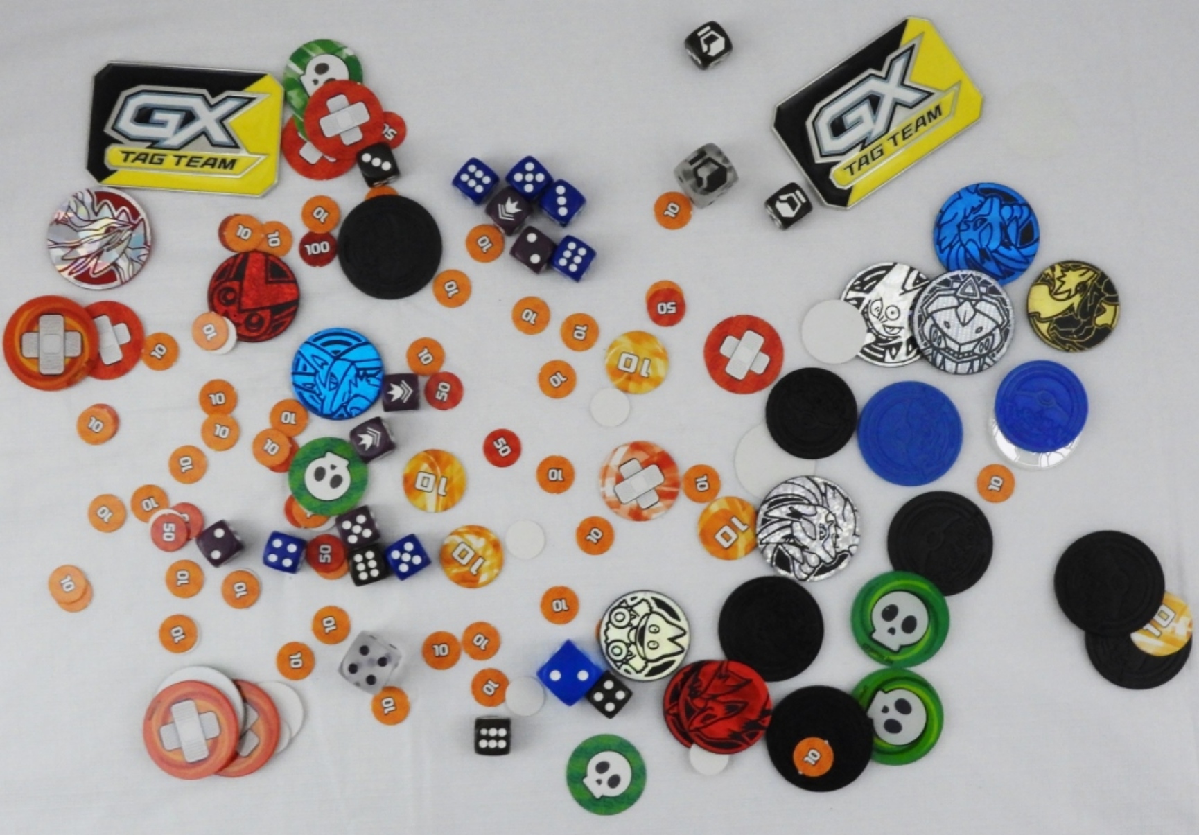 Including 27 Markers Mega Charizard, Pokemon Gold Trader, Alolan Raichu, Coin Silver Holo Color, Pikachu Coin, 18 Small Dice, 3 Large Dice, & Cardboard Markers