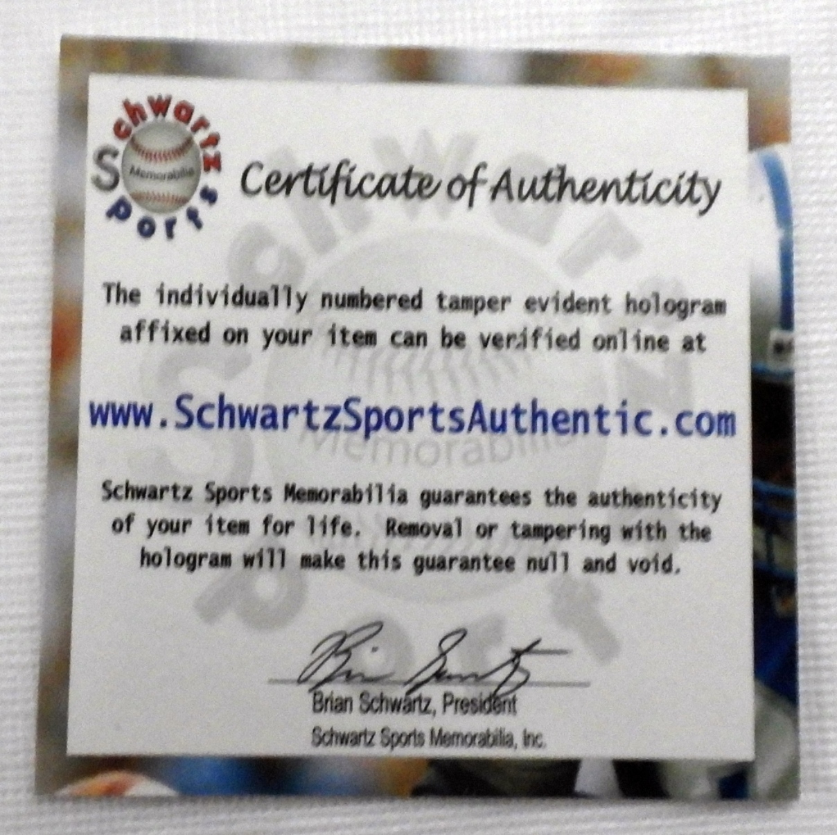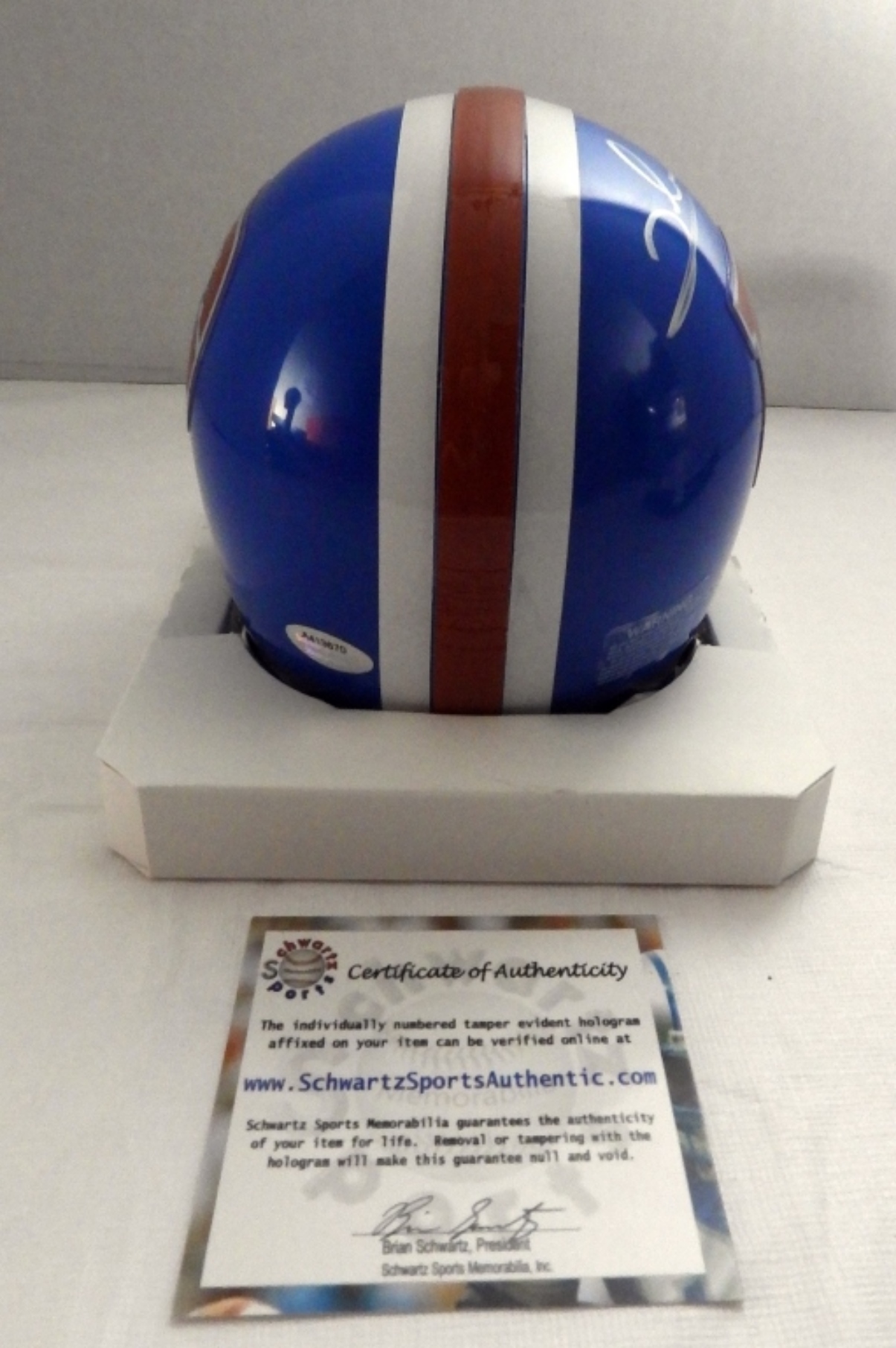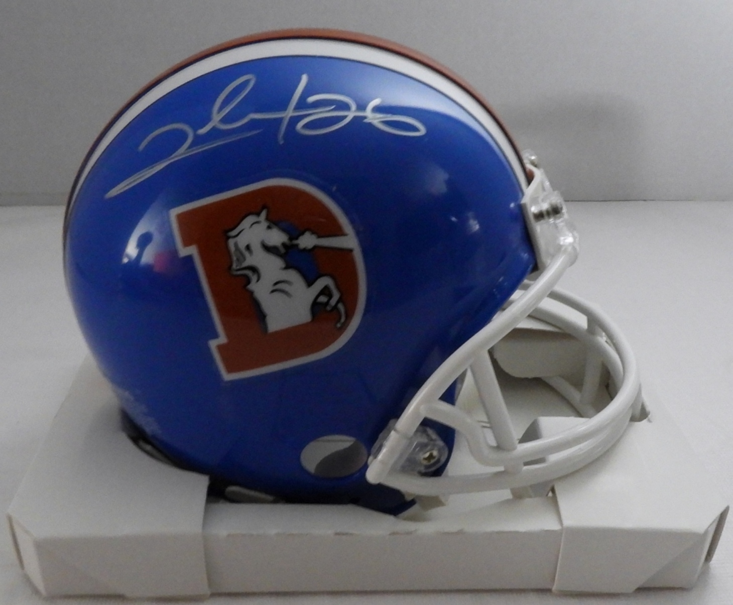 From Schwartz Sports Authentic COA is verified. A413670. Signed on Denver Bronco mini helmet.