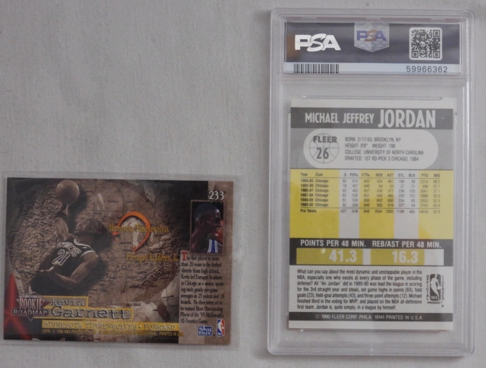 Michael Jordan is MINT 8, graded by Professional Sports Authenticator. Kevin Garnett is not graded.