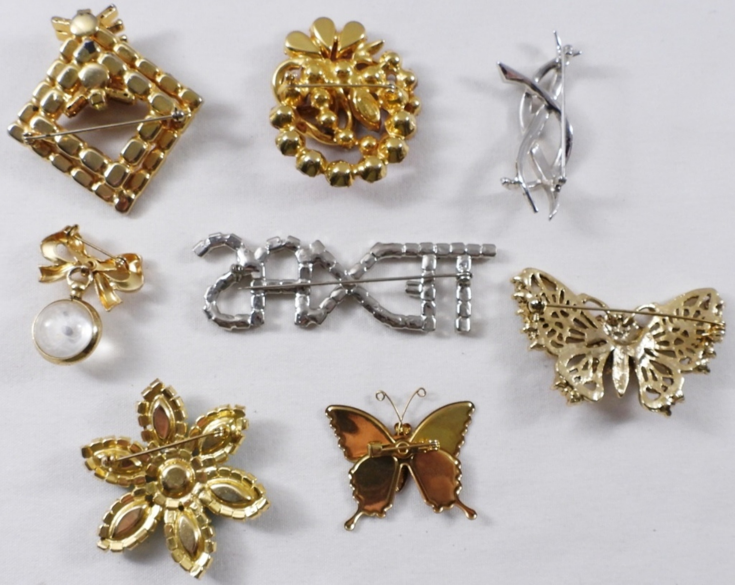 8 Fashion Brooches- Butterfly, Flower, Texas. Some of them have rhinestones. 1- Mustard Seed brooch gold toned.