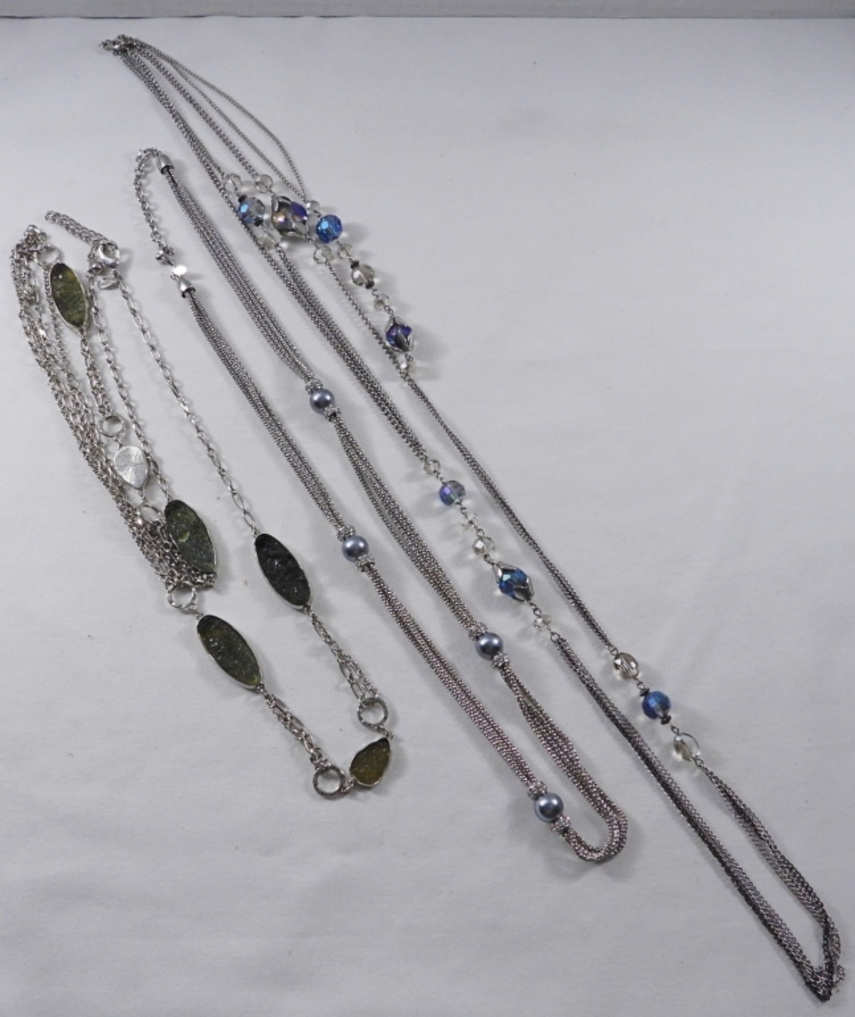 3 Silver-toned necklaces (20+”) with beads and rhinestone. One of the necklaces has a broken spot.
