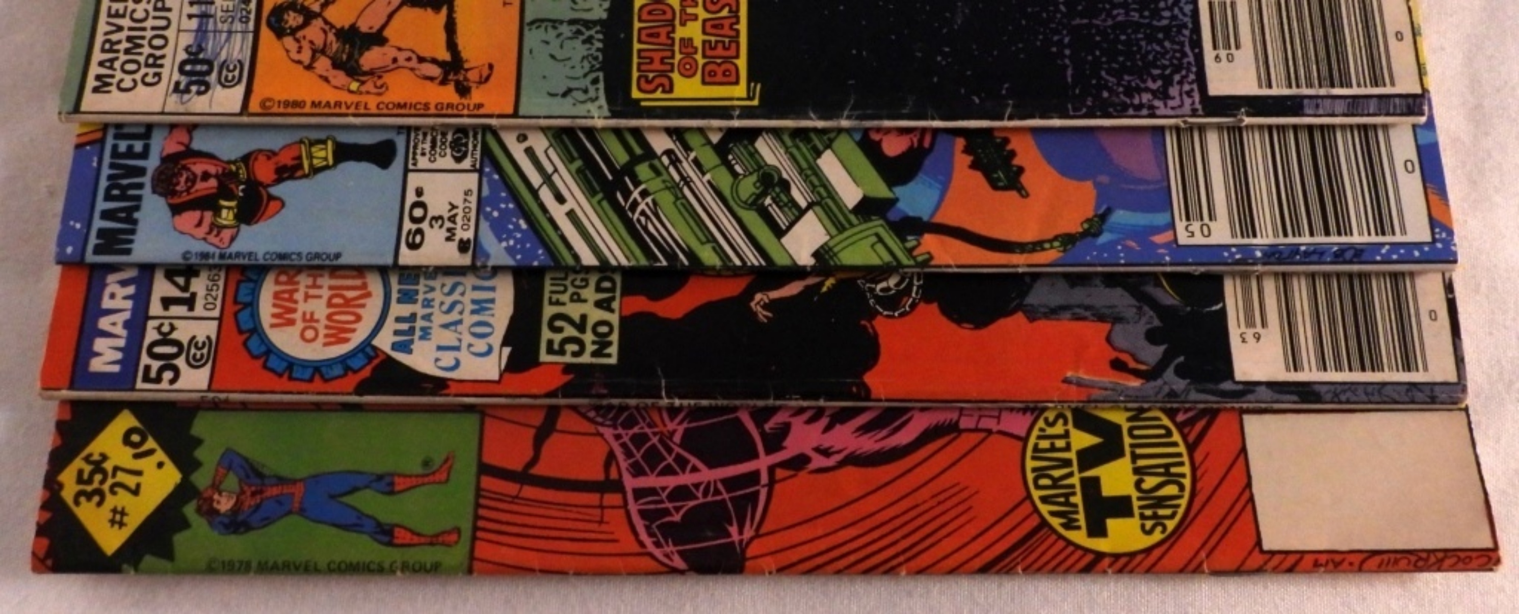 1) Peter Parker The Spectacular Spider-Man #27 (Someone wrote .10 on the cover next to the number. 2) War Of The Worlds #14. 3) Conan The Barbarian #114. (Someone colored over the price and number with a pen.) 4)