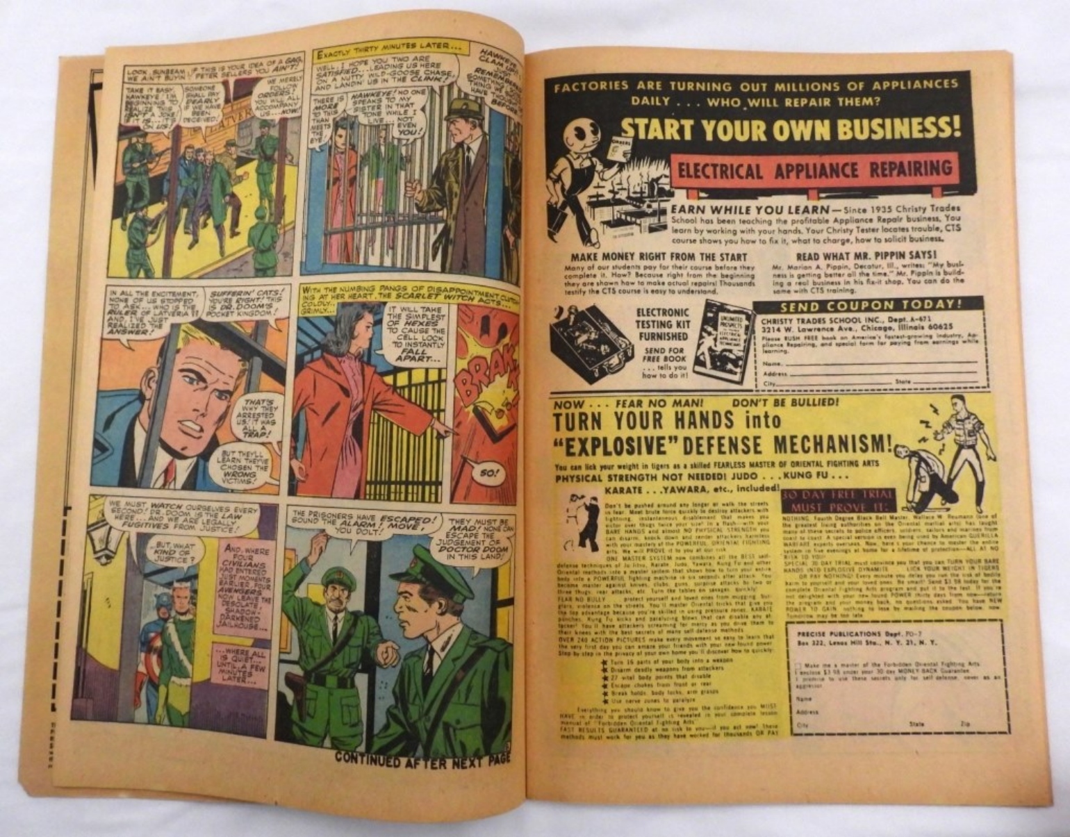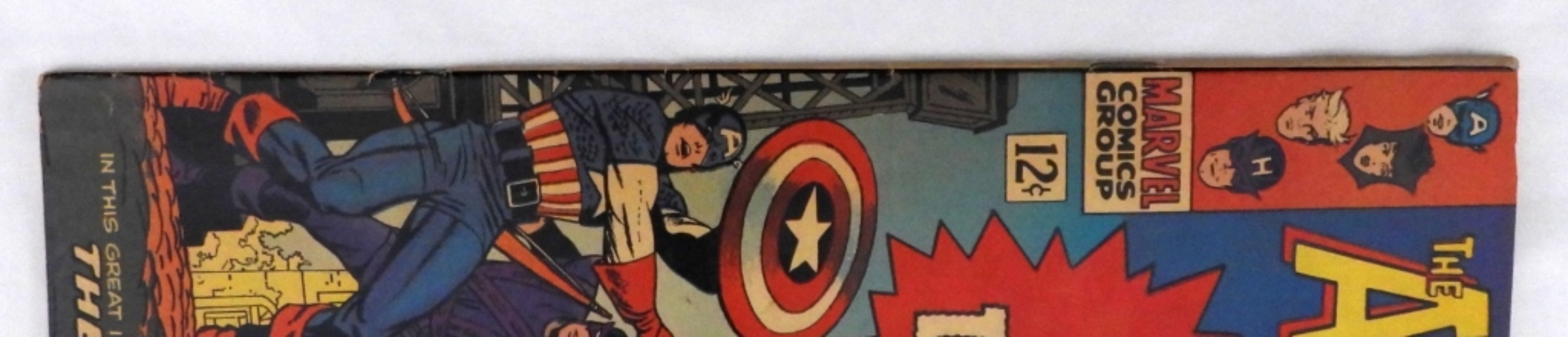 In G/VG condition (the bottom right corner is ripped). 12-cent issue. This is the first battle of The Avengers vs Doctor Doom. Hawkeye is shown wearing gloves on the cover, a deviation from the character design in all.