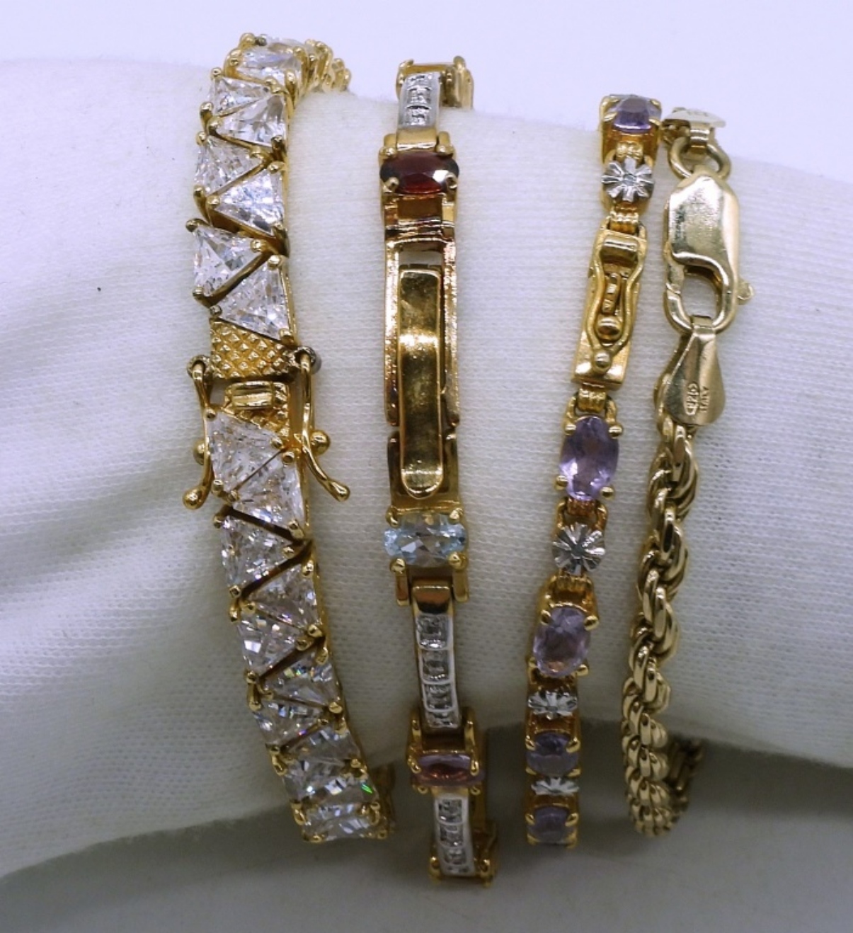 Four sterling, gold tone bracelets with gemstones. Simulated diamond, amethyst, citrine, garnet. 7-7.5″ long. (38 dwt)