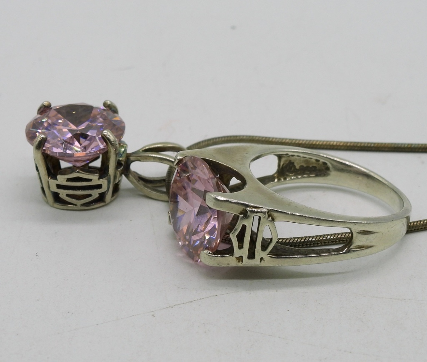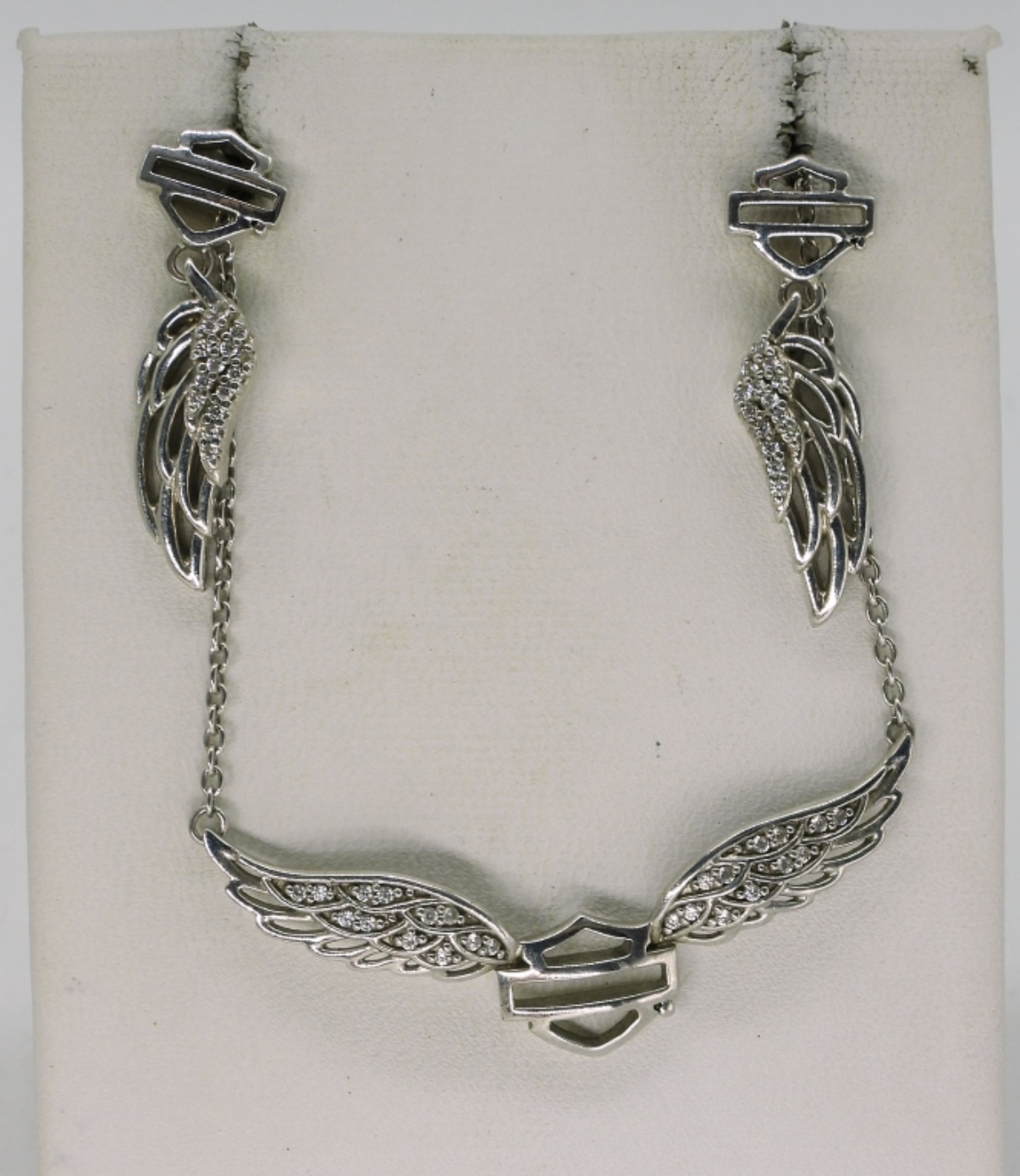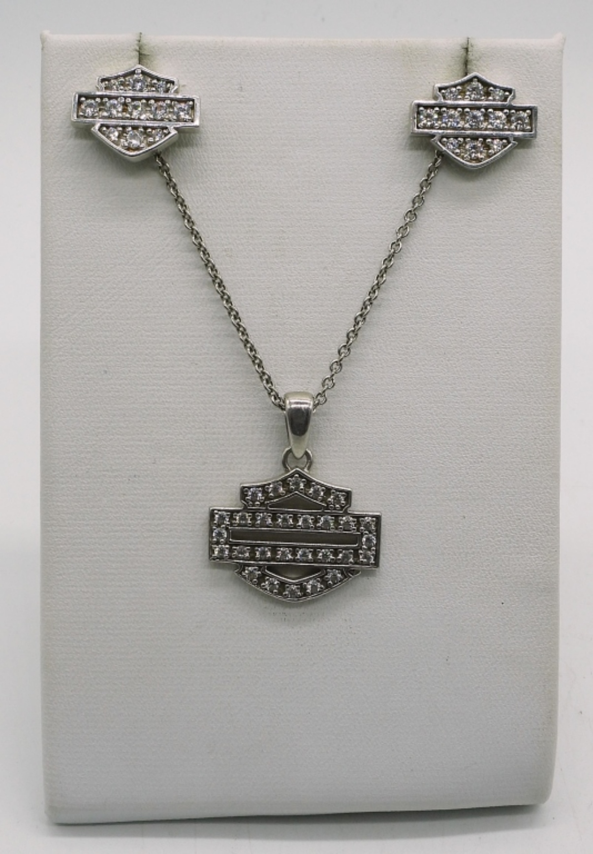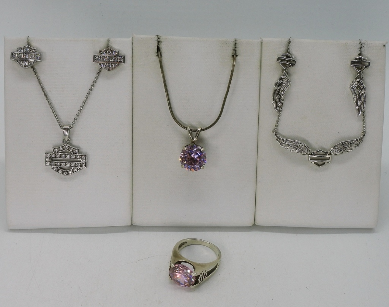 Three sterling necklaces, two pair of pierced earrings and one ring. All with the Harley Davidson style logo, not the words. Necklace lengths, 14-18″. Ring size 8. (21.5 dwt)