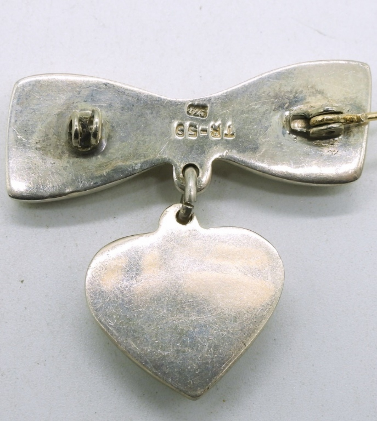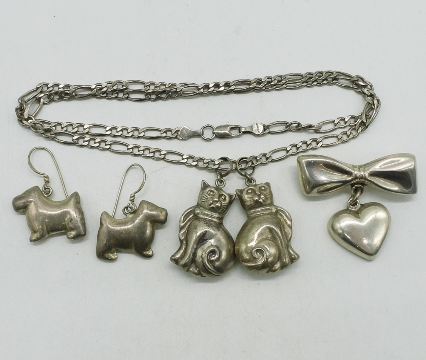 Two sterling cat pendants, 1.5″. Both on one sterling chain, 20″. Pierced dog earrings, 1″. Taxco sterling pin, TR-49. (22.2 dwt)