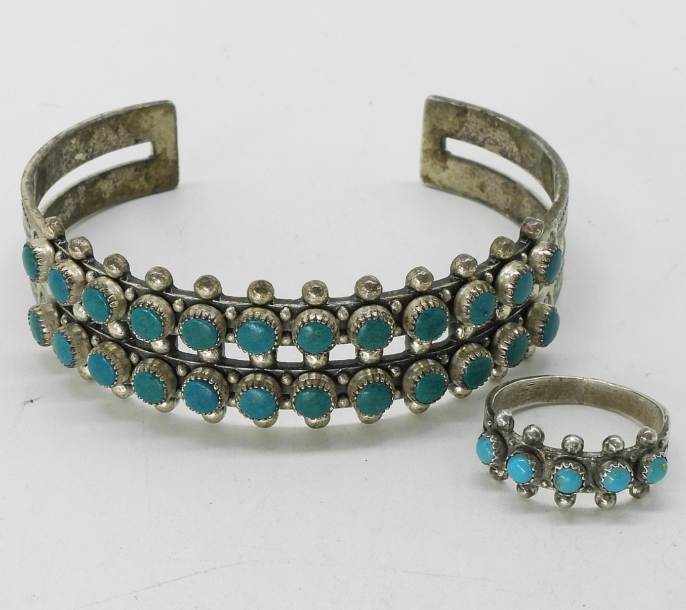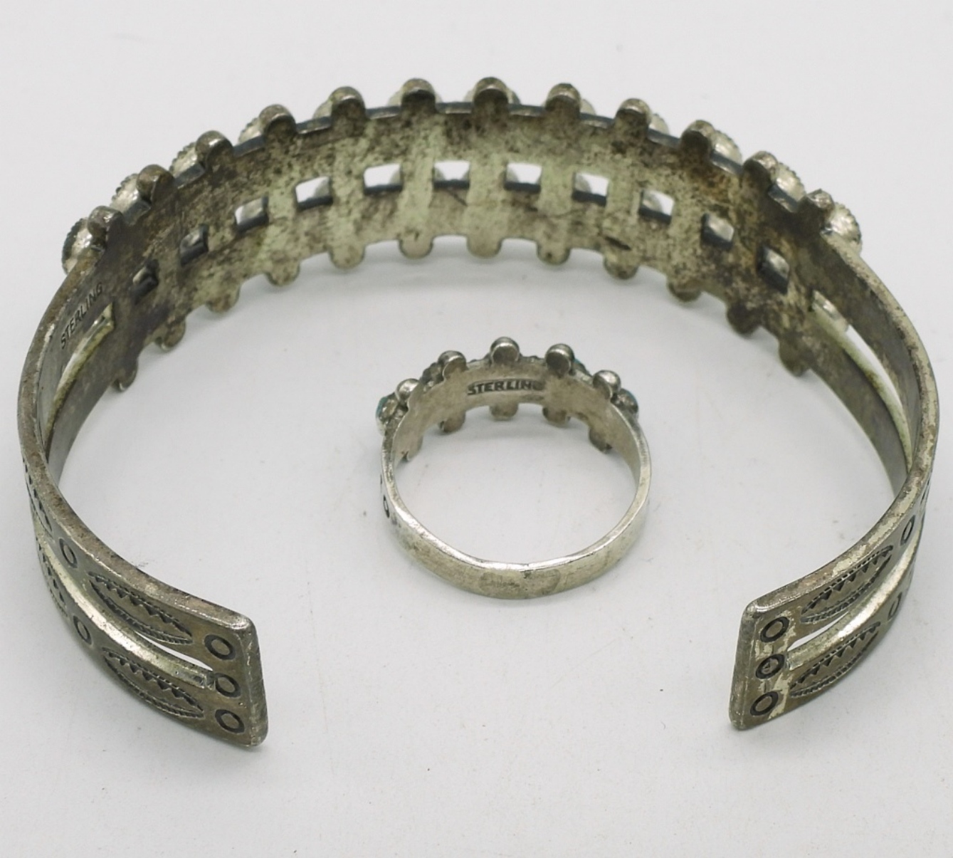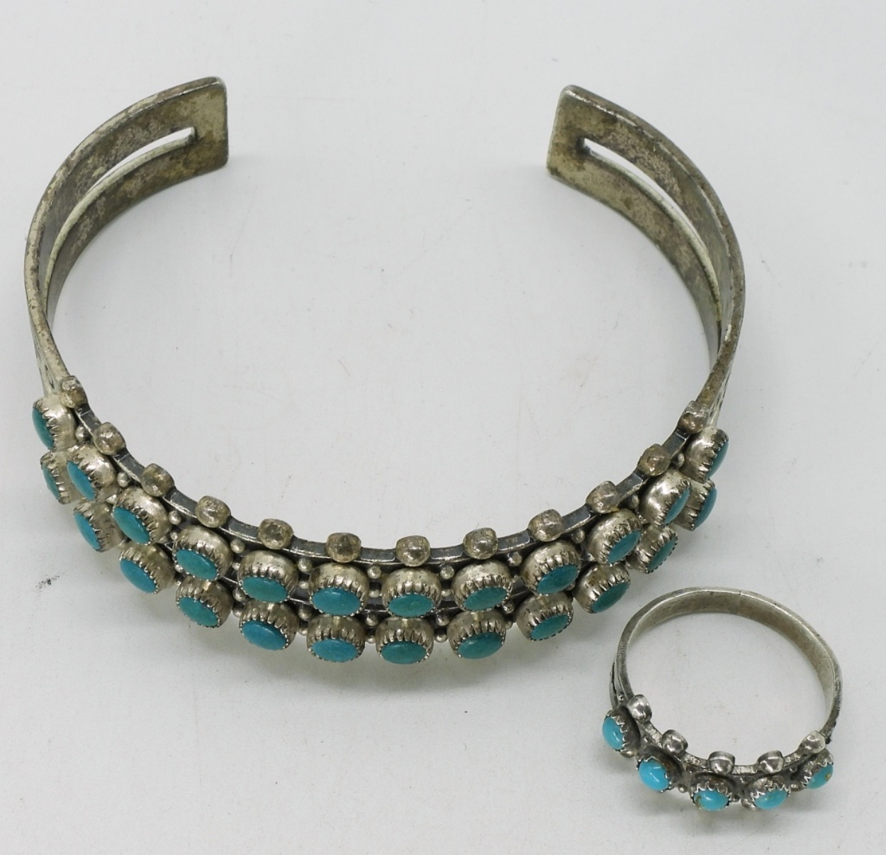Turquoise vintage sterling cuff bracelet and a matching ring, size 6. (17.7 dwt)