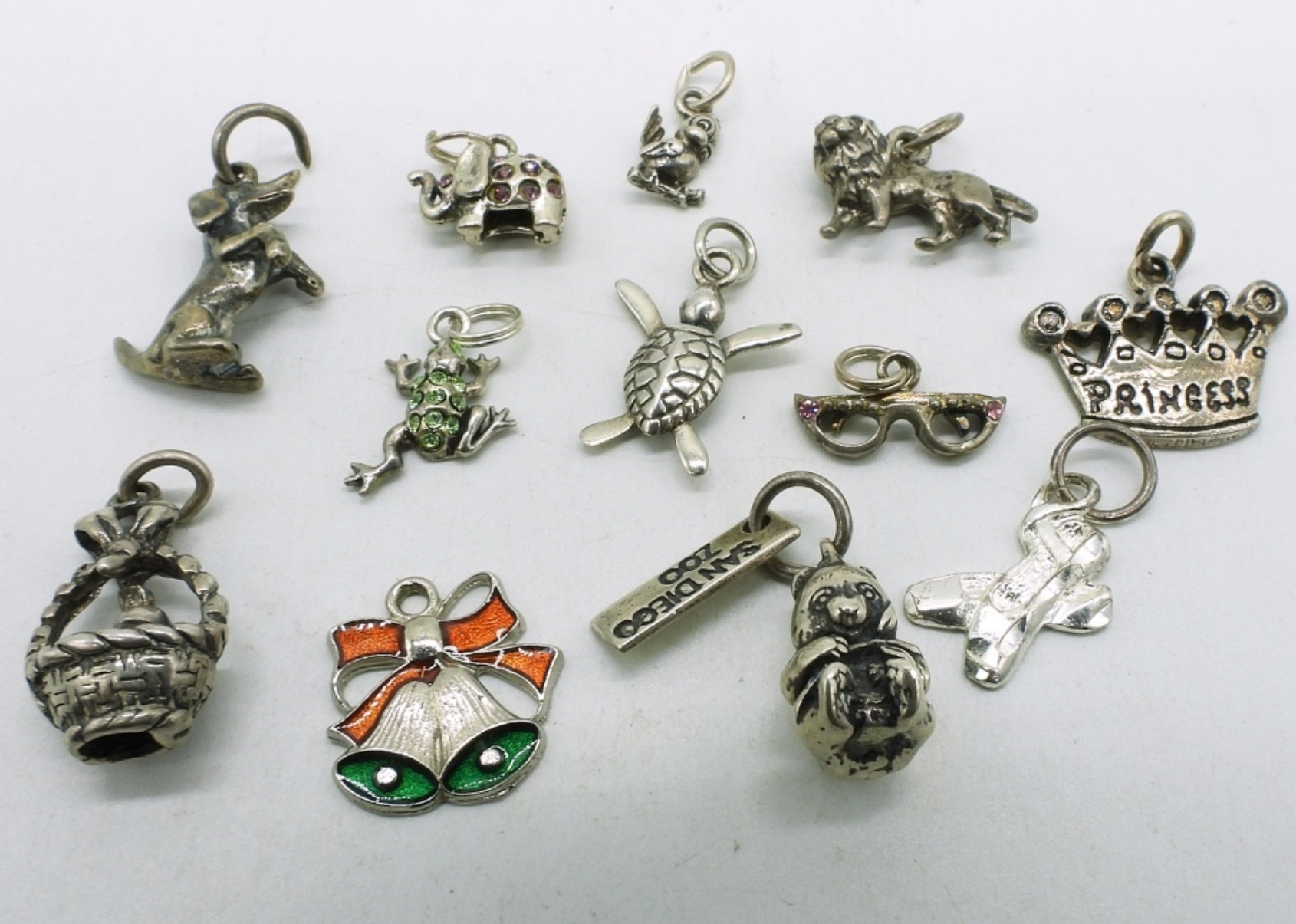 Twelve small sterling charms for bracelets. (13.1 dwt)