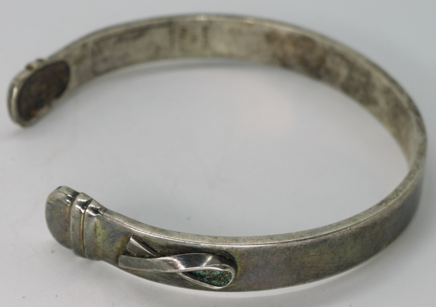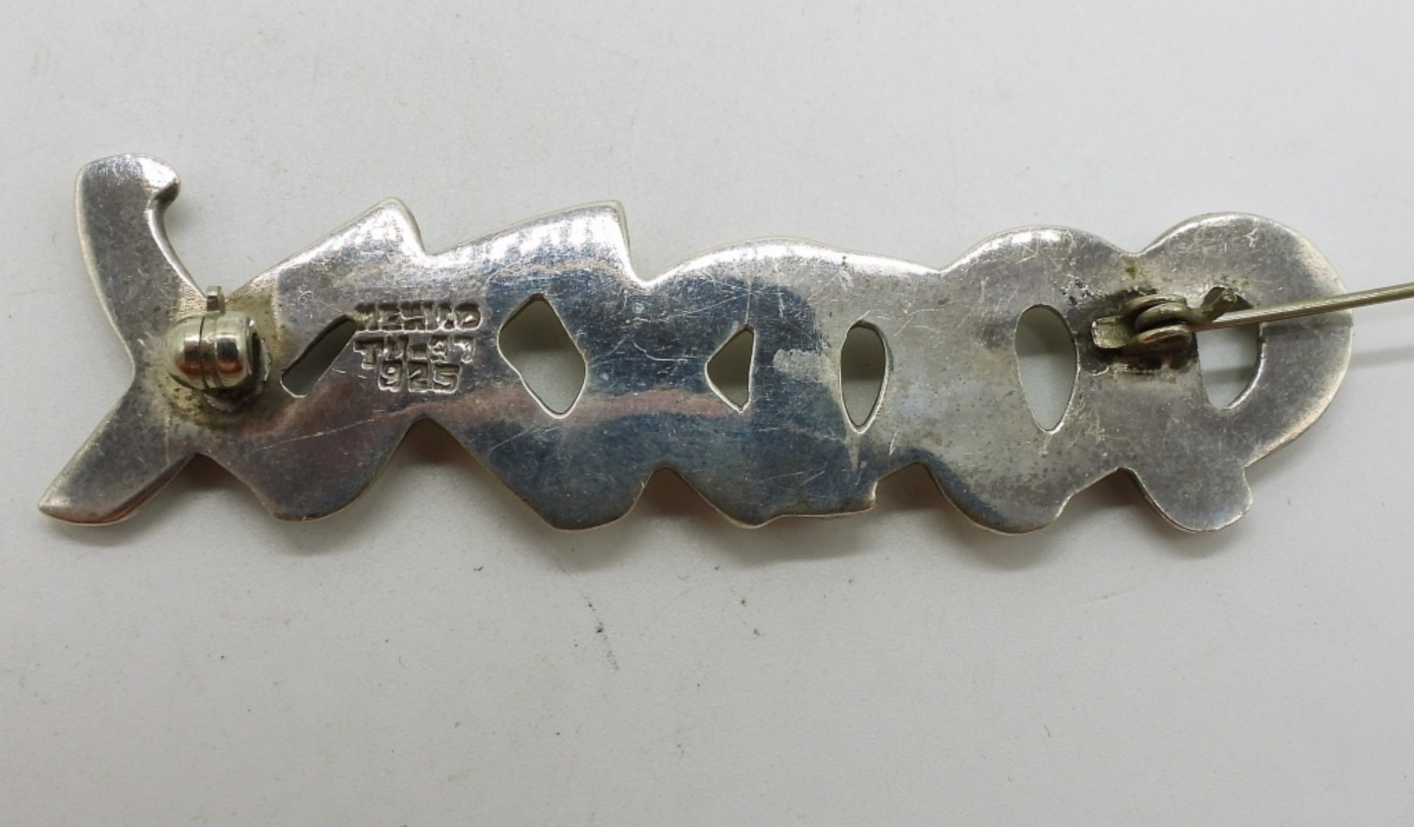 Sterling cuff bracelet, “until there’s a cure” engraved on the inside. Ribbon on the outside. XO sterling brooch, 3″. (22.5 dwt)