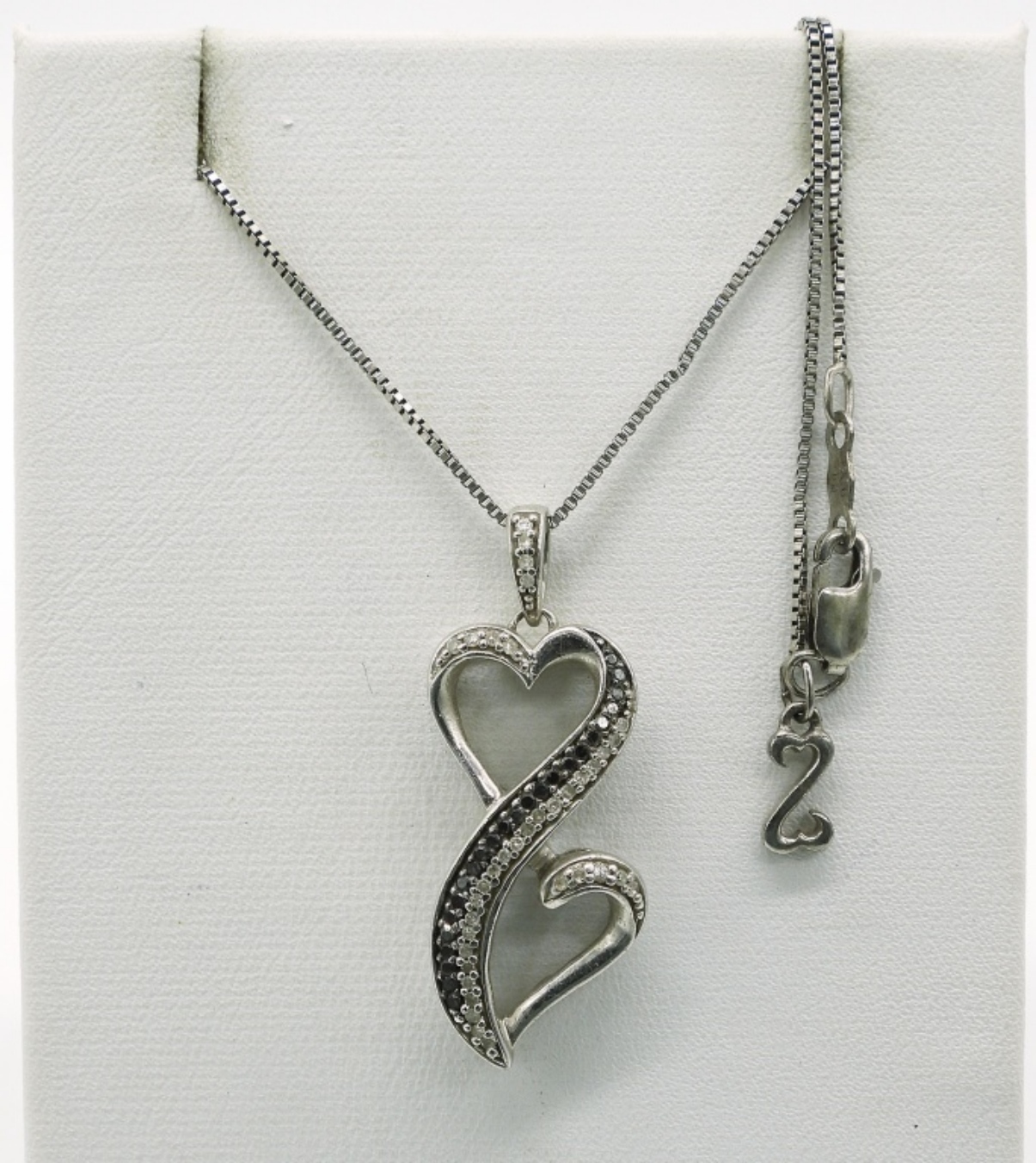 Open Heart, sterling necklace with black and white diamonds. Chain is 18″ long. (3.3 dwt)