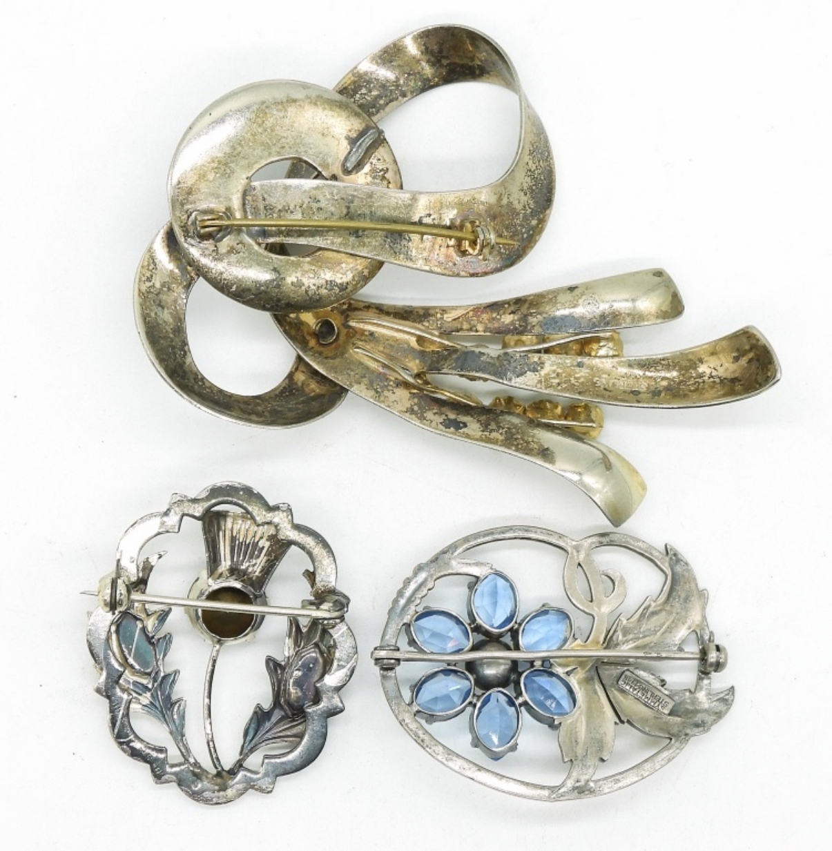 Three sterling brooches with colored rhinestones. 2-3.5″. (29 dwt)