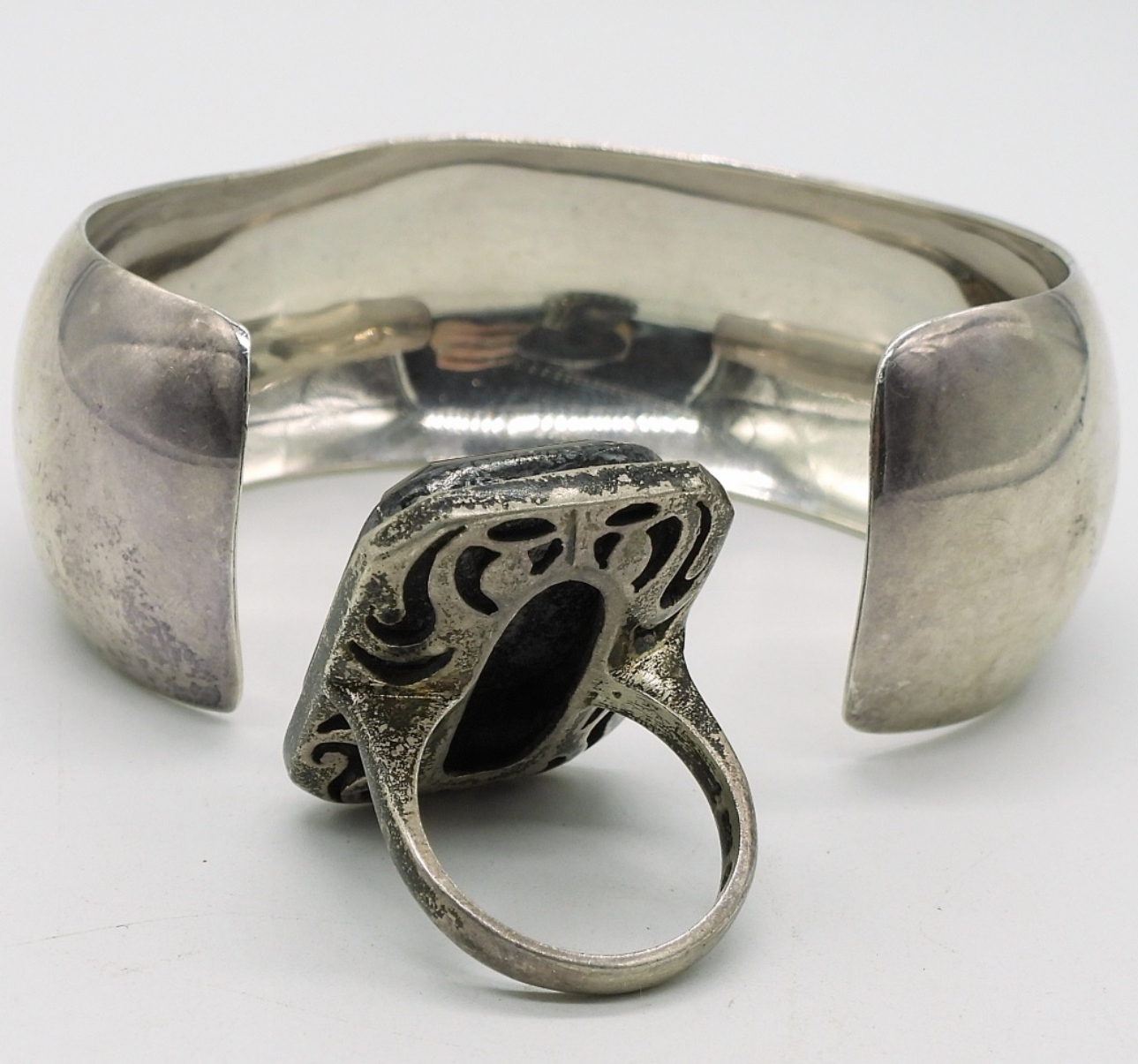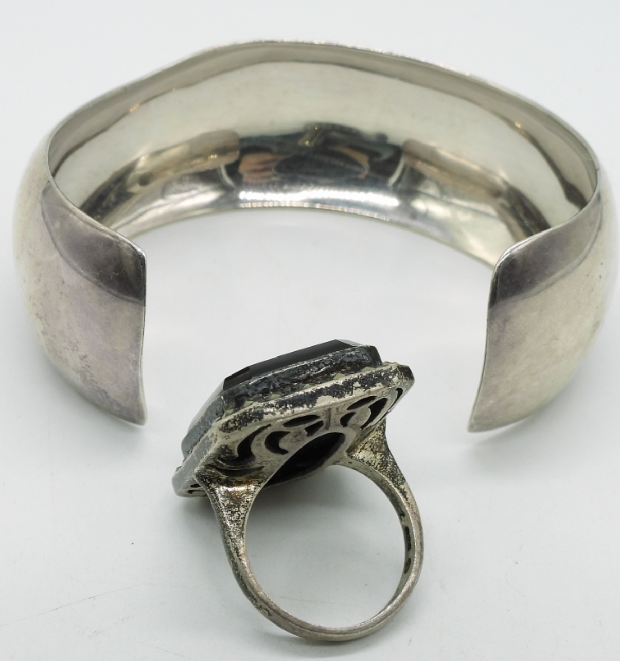 JAI Mexico 925 Cuff Bracelet, 1″ wide. Sterling Black Onyx & Marcasite Ring, size 7. (32.8 dwt)