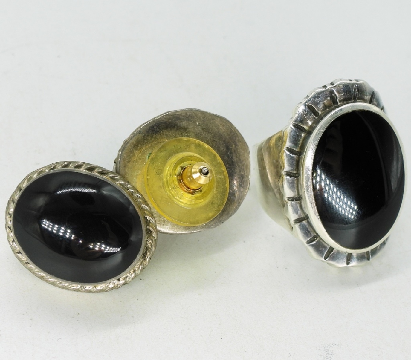 Sterling black onyx ring, size 6. Sterling black onyx pierced earrings. (15.8 dwt)