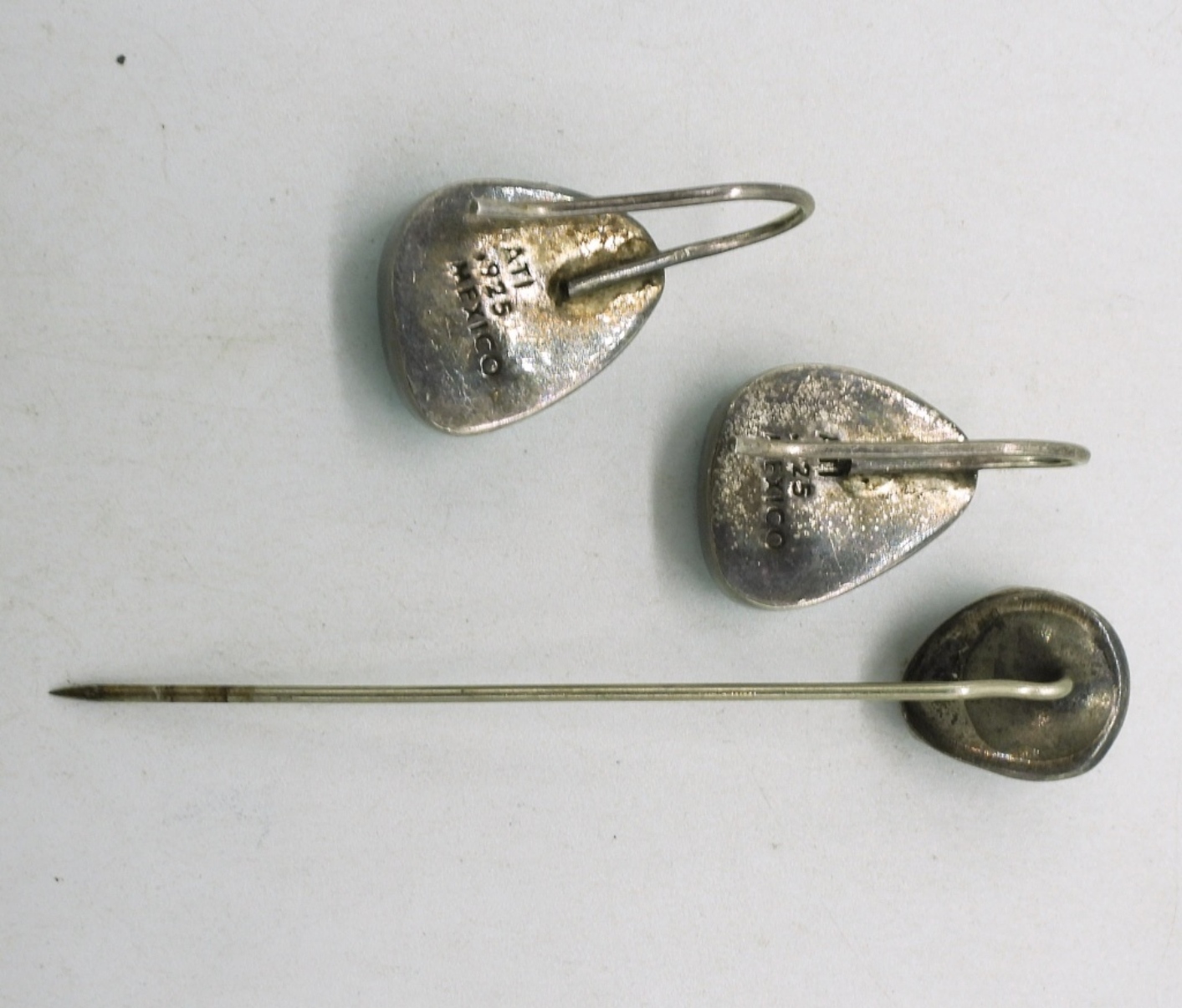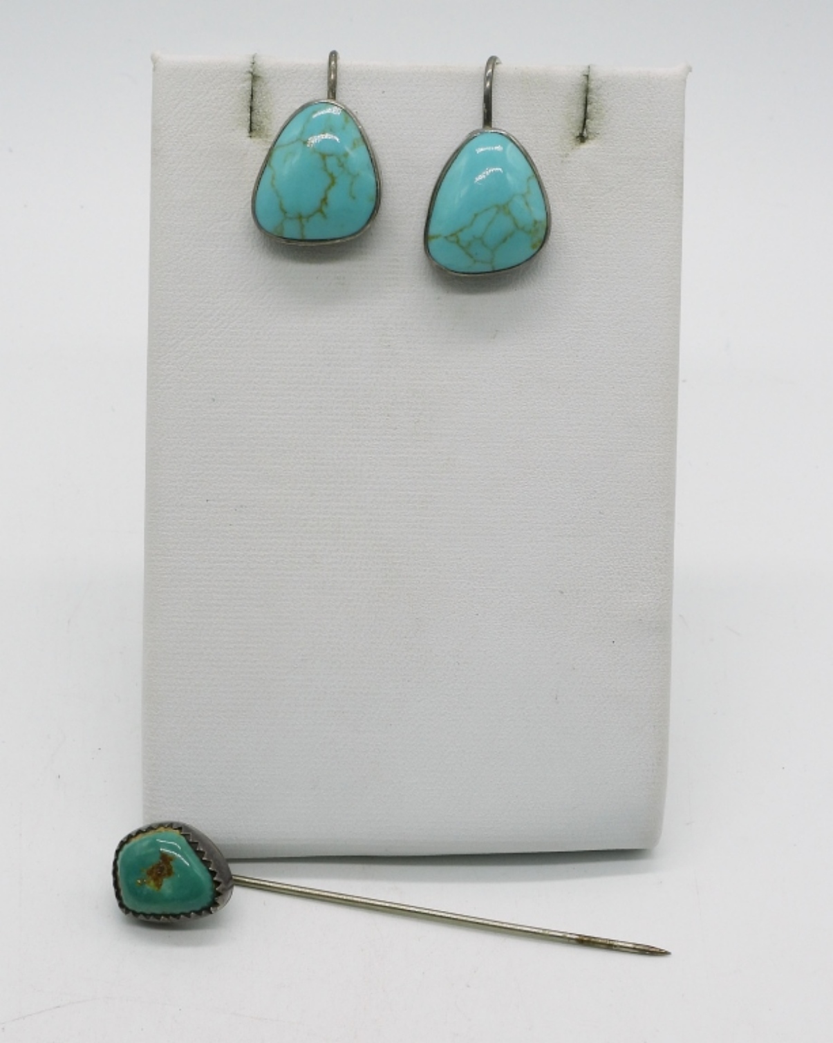ATI 925 Mexico Turquoise pierced earrings. Old sterling, turquoise gemstone stick pin. (6.5 dwt)