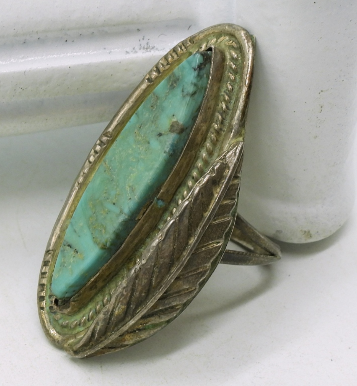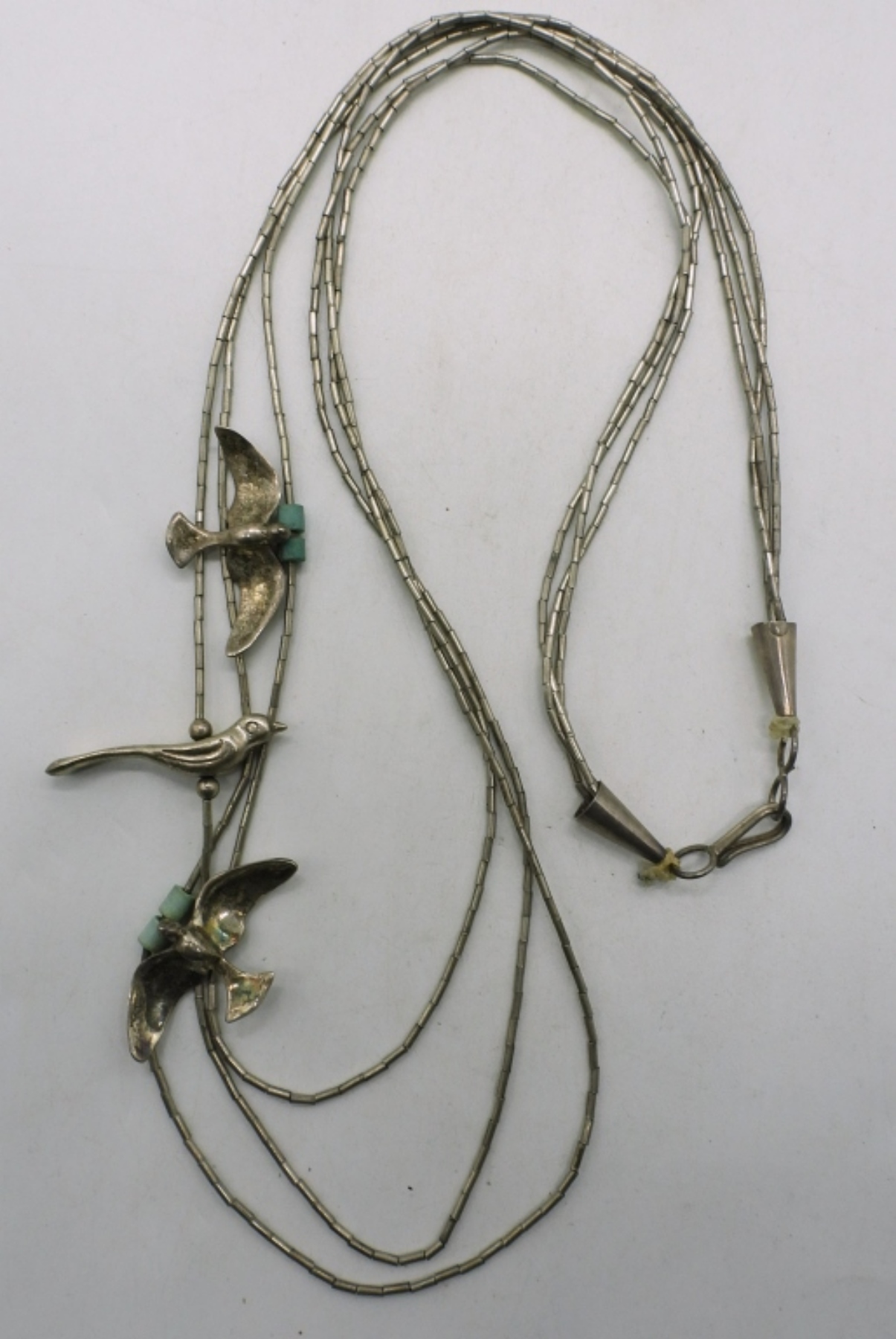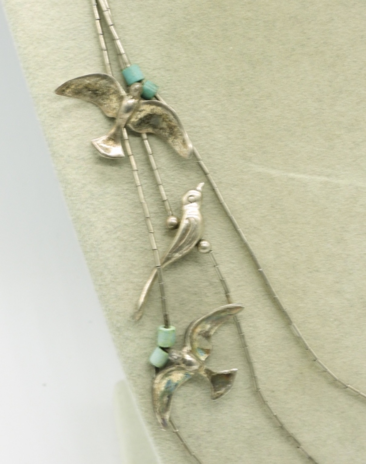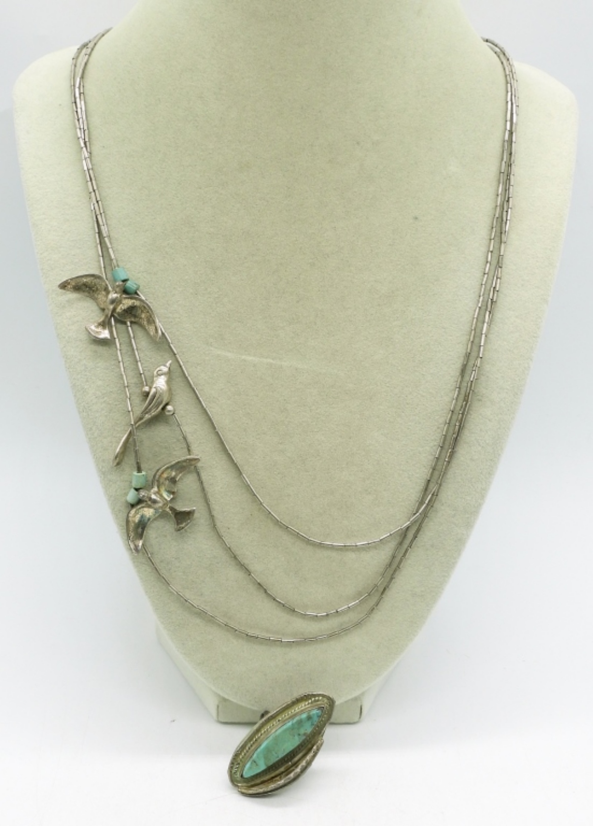 Vintage liquid sterling necklace with birds and turquoise beads, 24″. Sterling turquoise ring, size 6.5 (20 dwt)