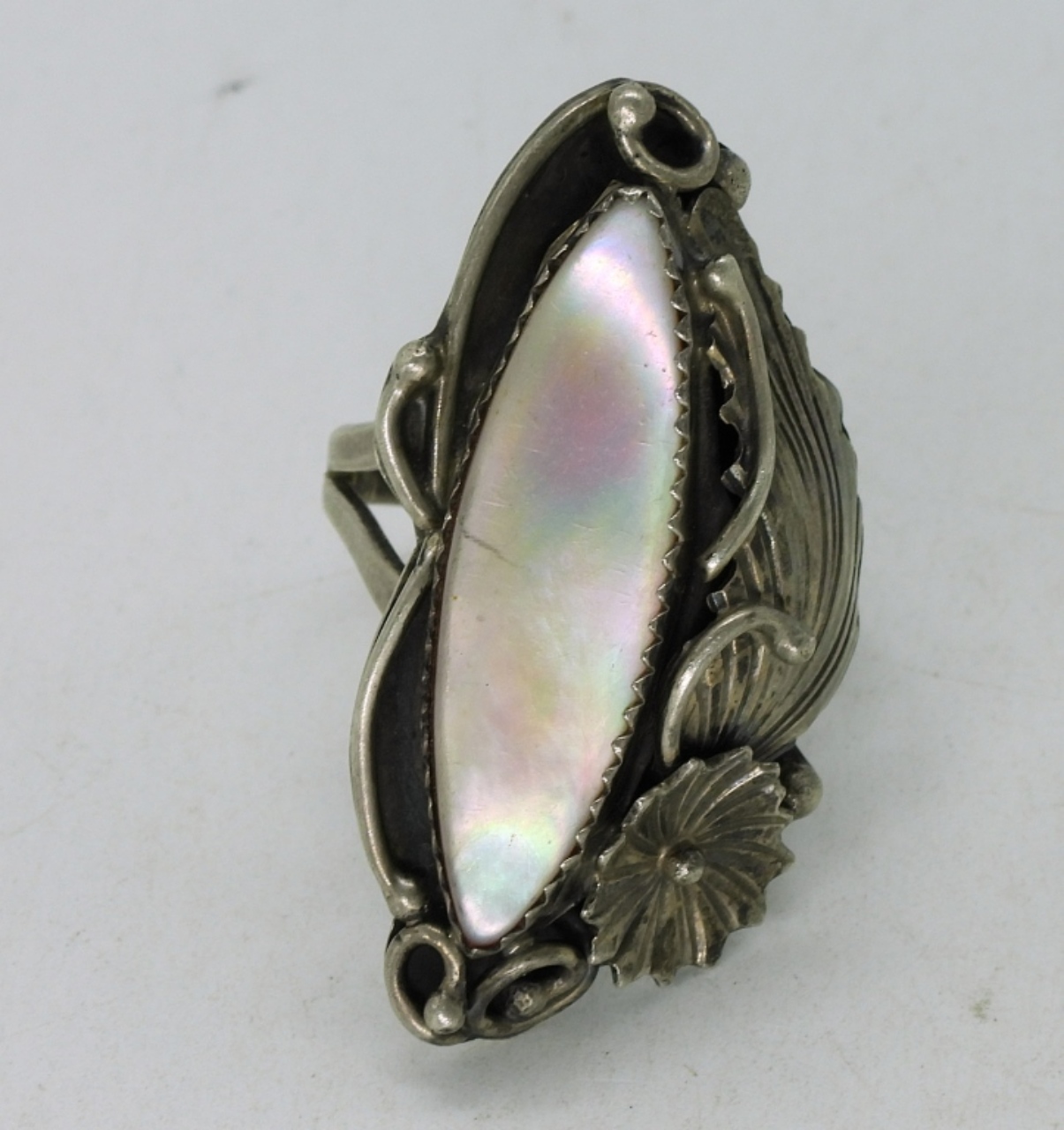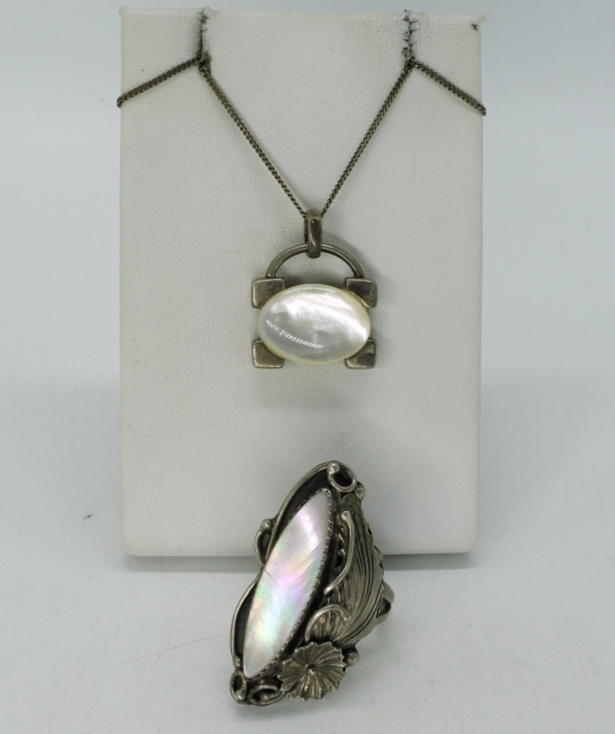 Mother of Pearl sterling ring and necklace. Ring is size 9. 16″ sterling necklace. (11.3 dwt)