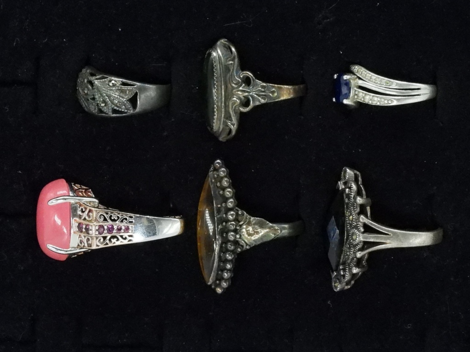 Six sterling fashion gemstone rings. Sizes 7, 8, 9. (21 dwt)