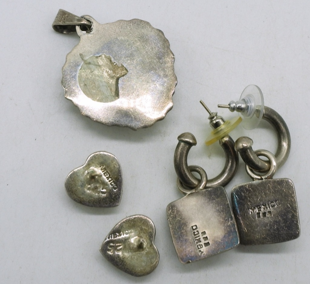 Two pair of pierced earrings, sterling with red gemstones. Heart Pendant and Necklace, 18″. (34 dwt)