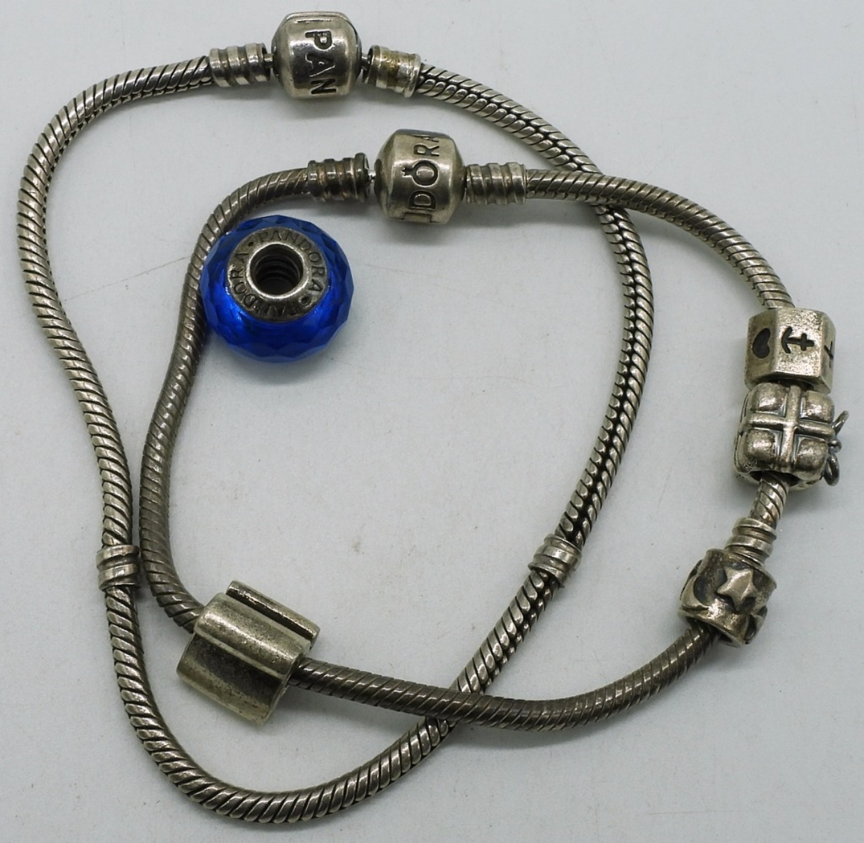 Two sterling pandora charm bracelets with 5 beads. (28 dwt)