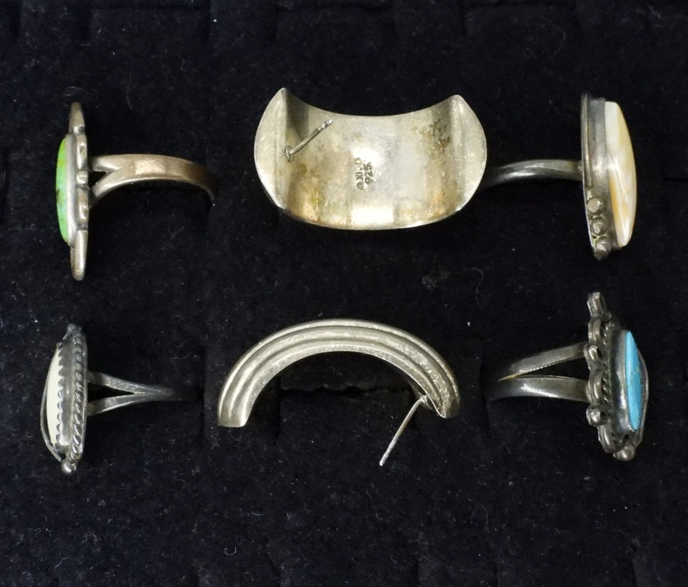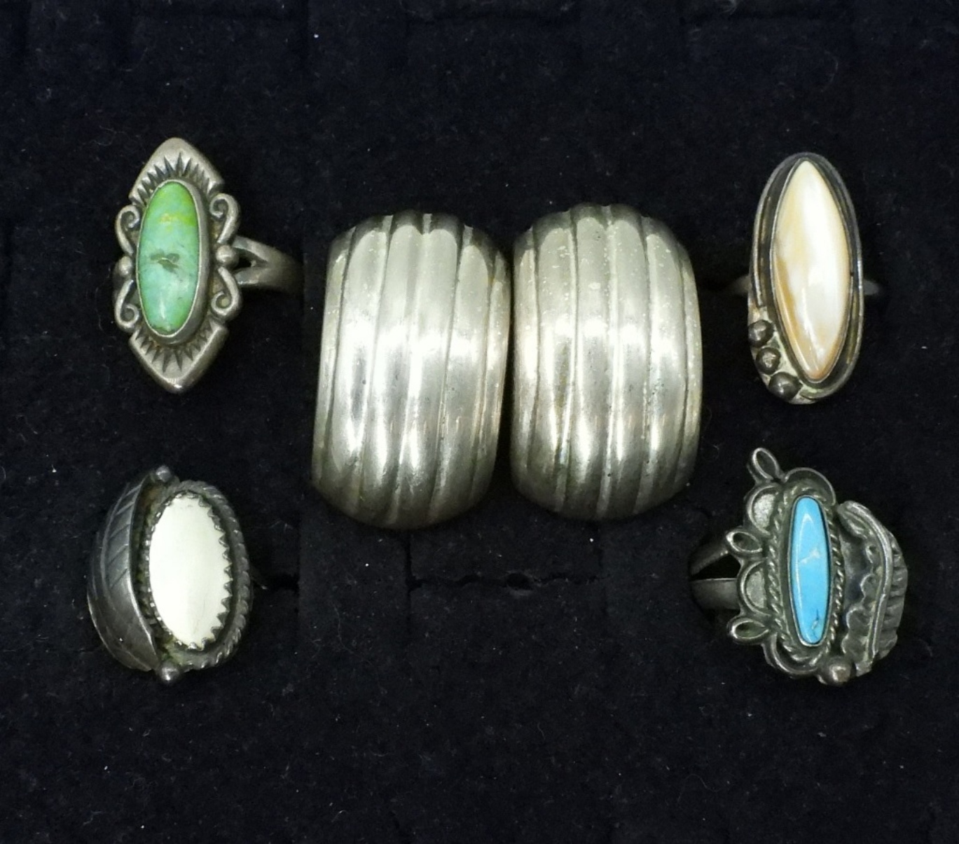 Four sterling rings, tarnished. With Blue & Green Turquoise as well as Mother of pearl. Pierced sterling earrings. (22 dwt)
