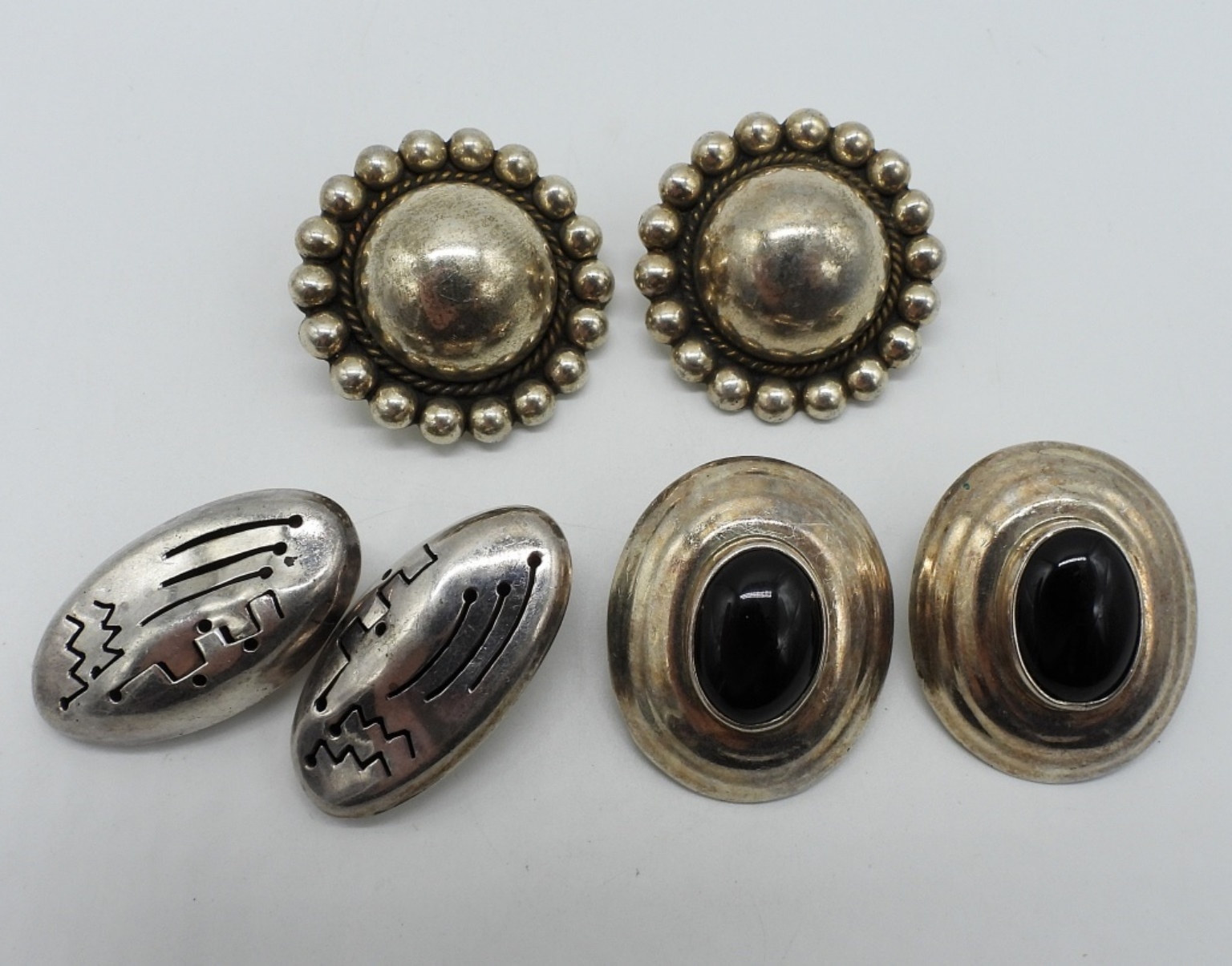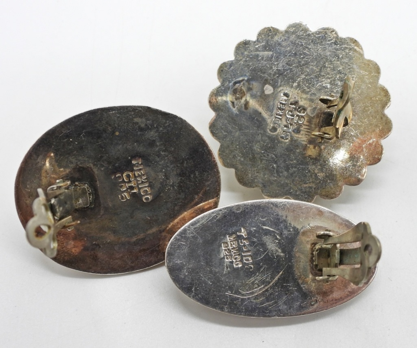 Three pair of sterling clip on earrings. All are Taxco & CII. 1.5″ (44.4 dwt)