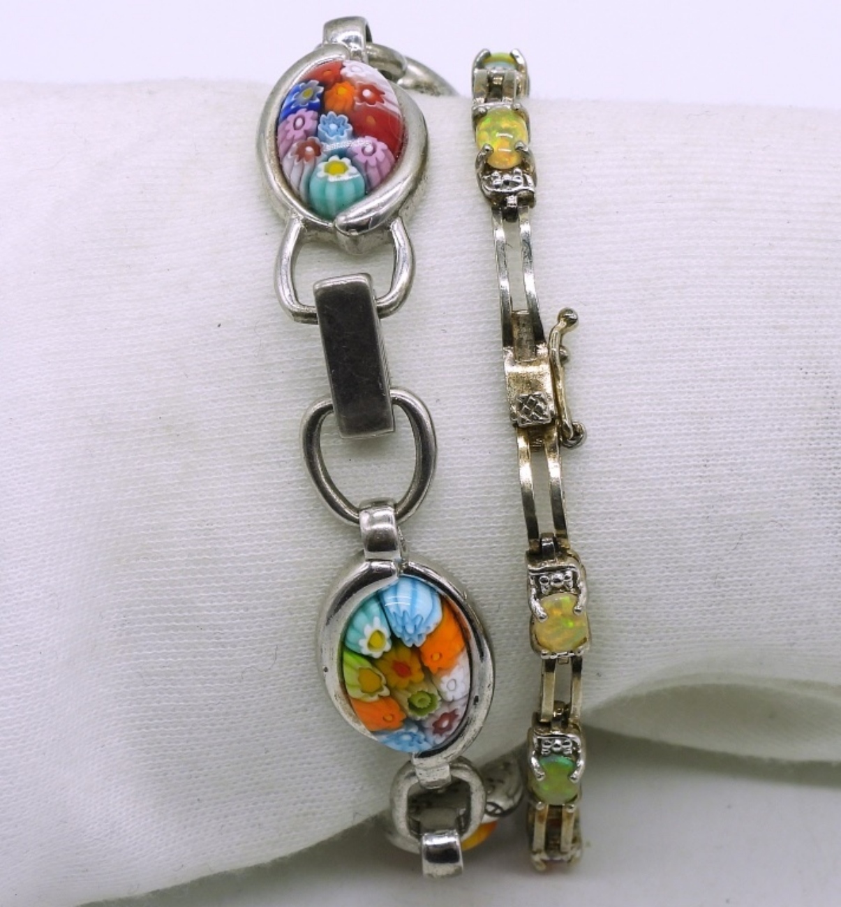 Two sterling fashion bracelets, opals and painted glass. 7.5″-8″. (26 dwt)