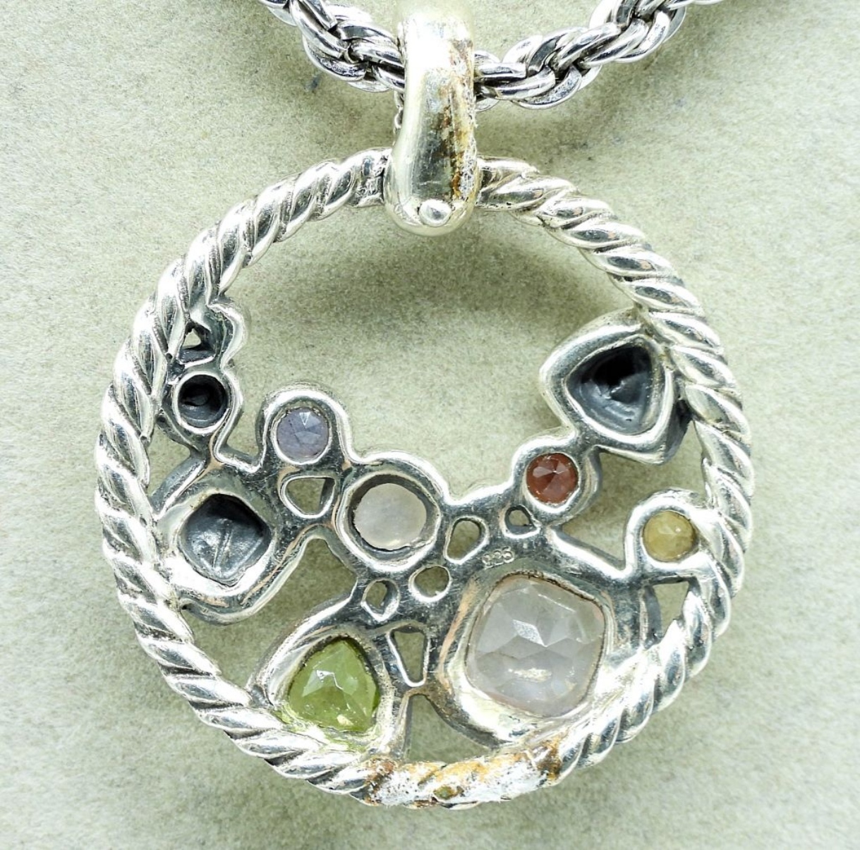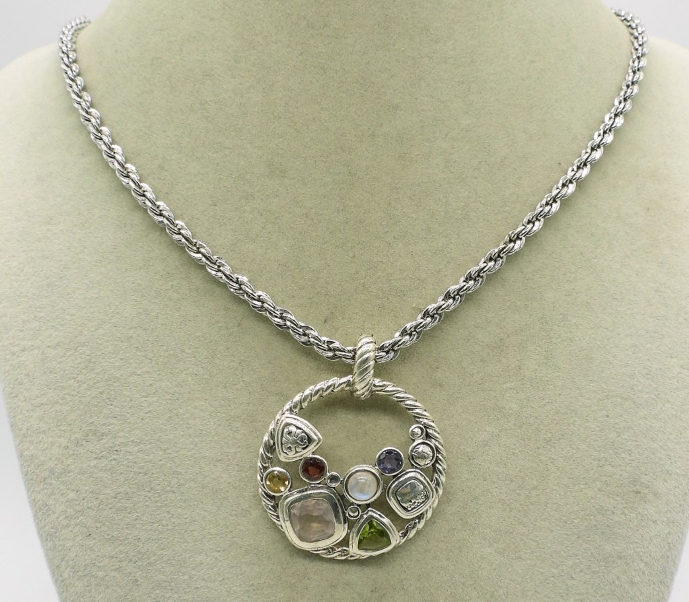 Round sterling, mixed gemstone pendant on a 24″ sterling chain. (27.4 dwt)