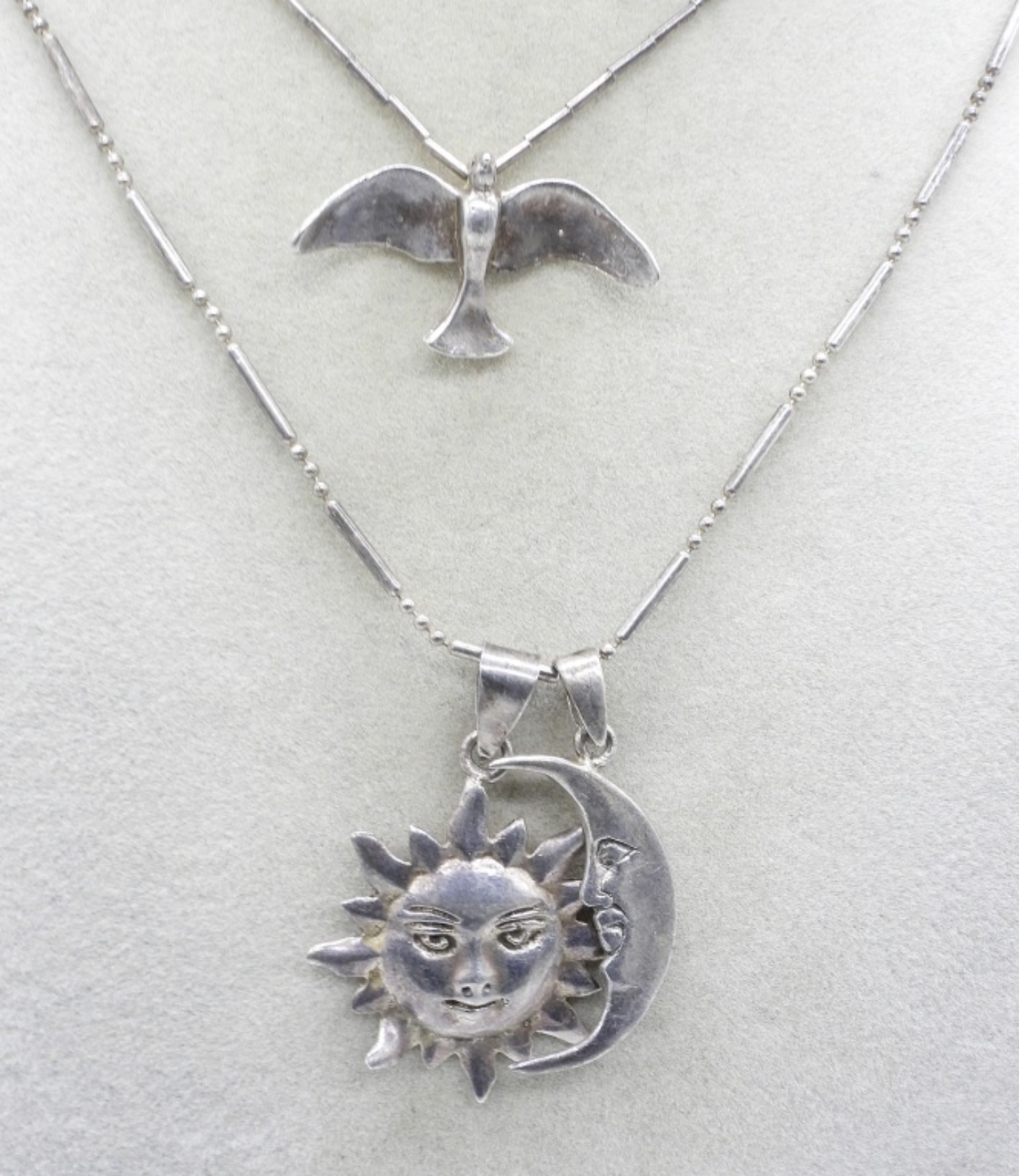 Sterling fashion necklaces, 16″ & 24″. Two pair of pierced earrings, hoops are silver on one side and gold tone on the other. (26.8 dwt)