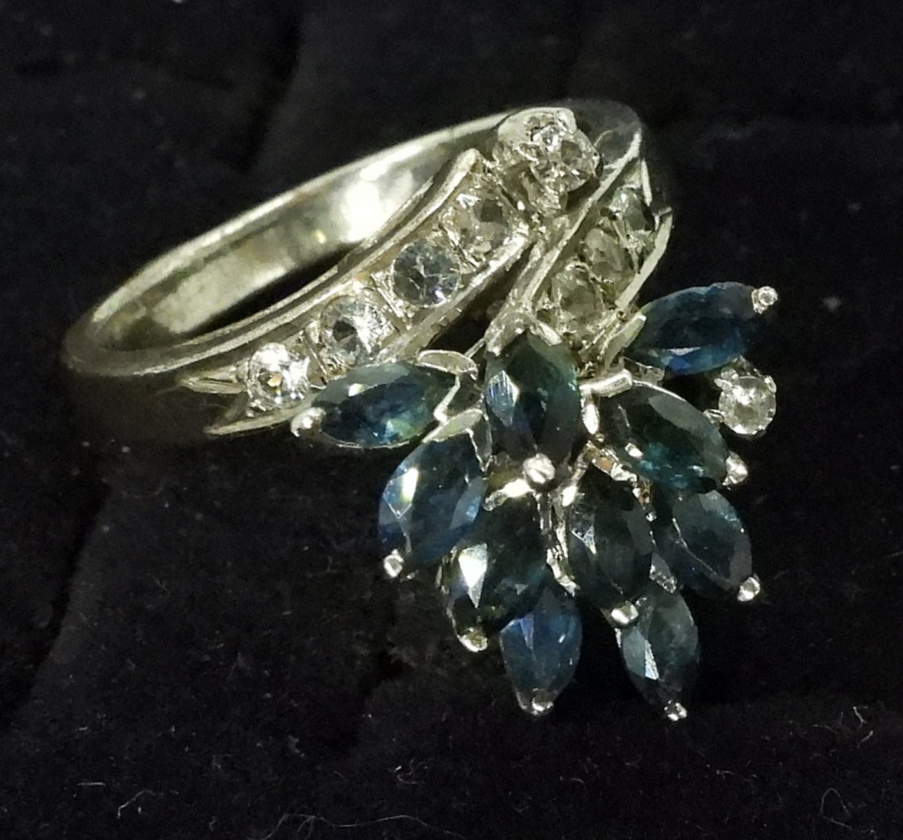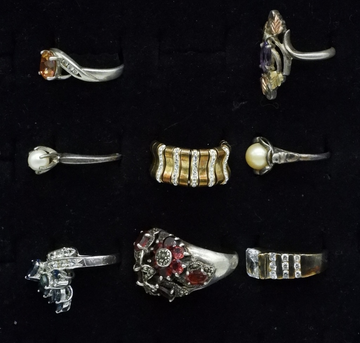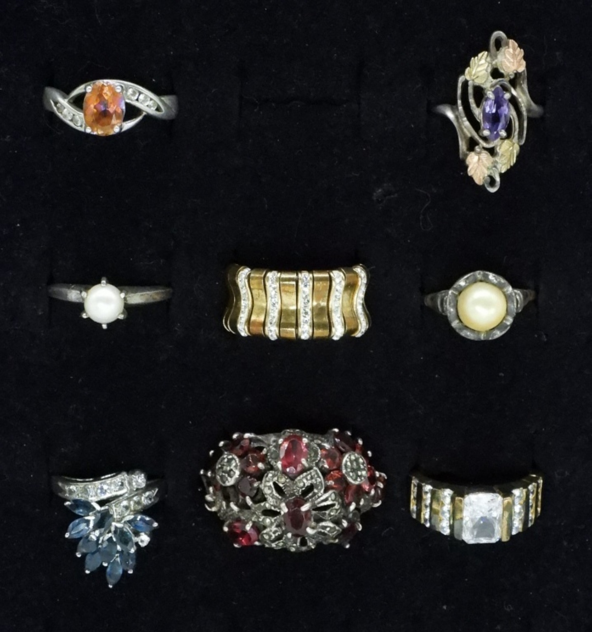Eight sterling fashion rings with simulated diamonds, pearls, amethysts and garnet. Sizes 6-9. One is stretchy but marked “925 Mom Jordan”. (26 dwt)