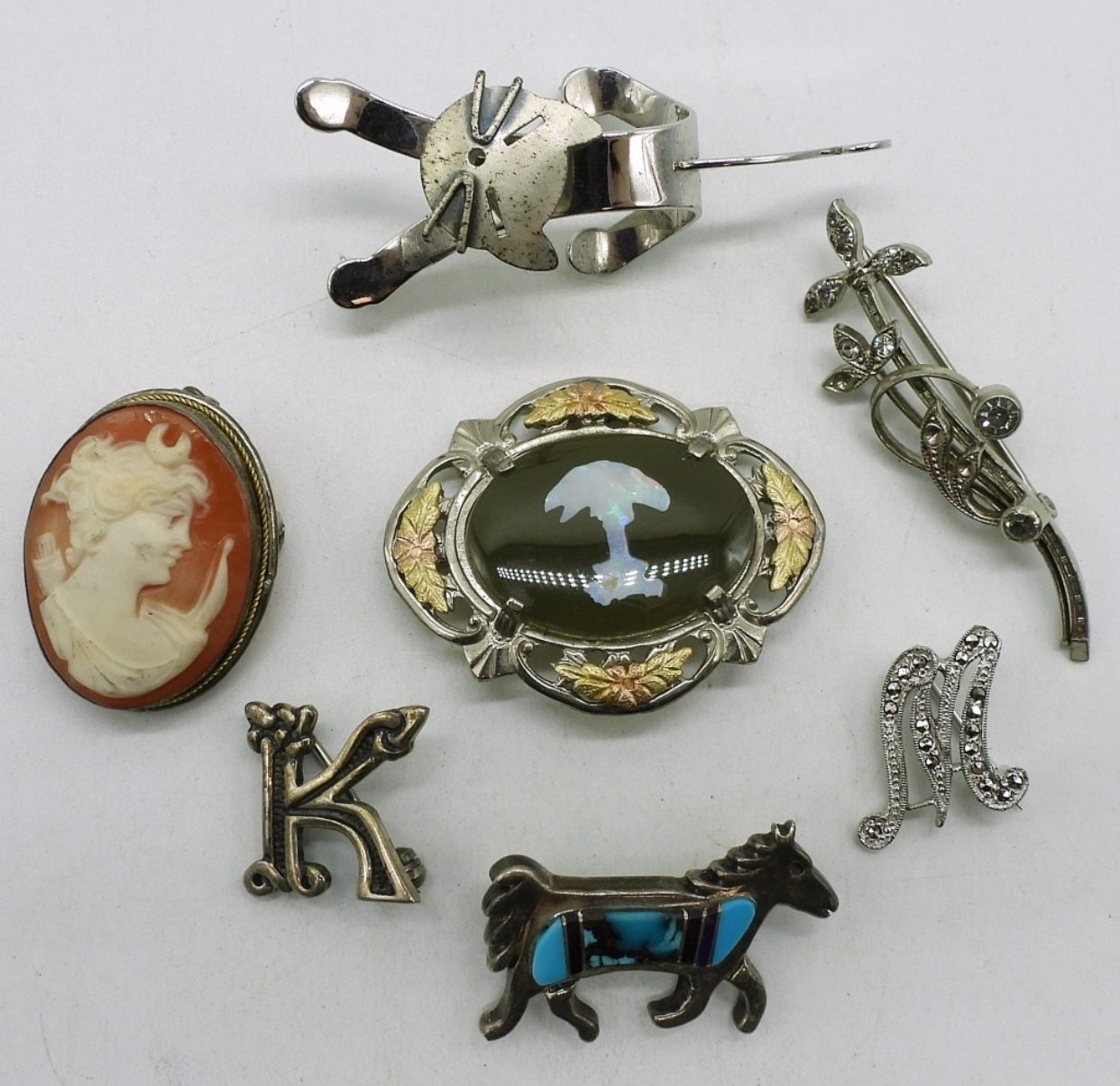 Seven sterling vintage brooches. Cameo, Opal, Initials & Turquoise. (20 dwt)