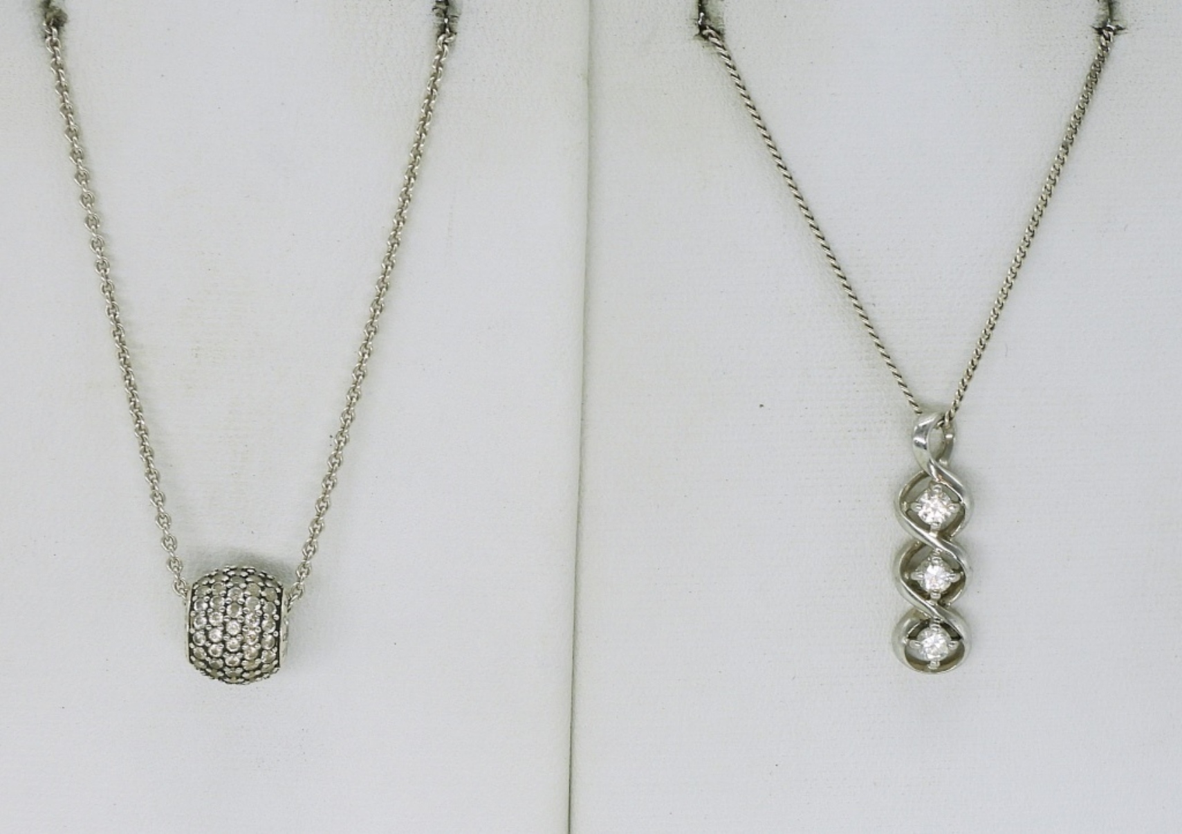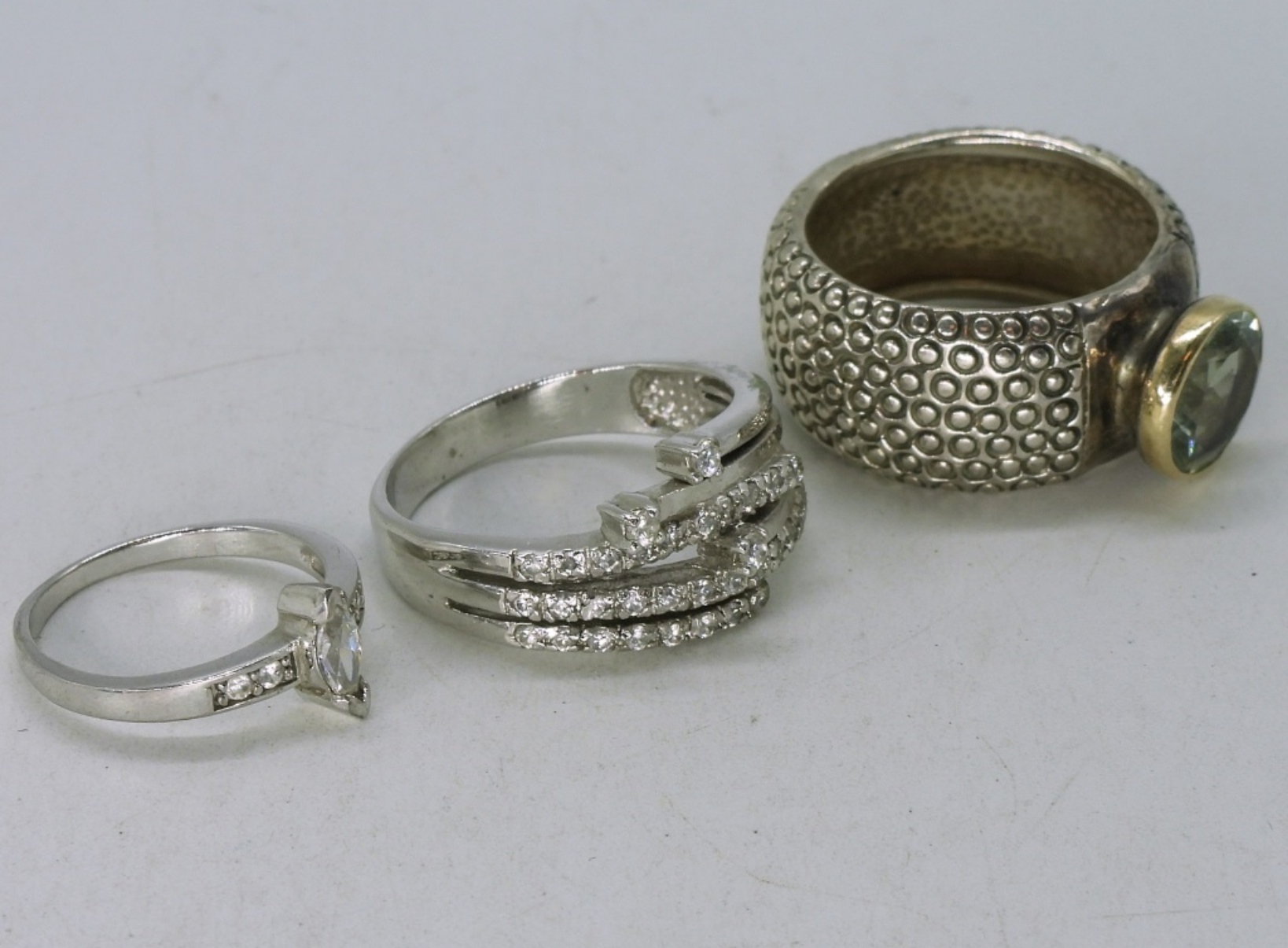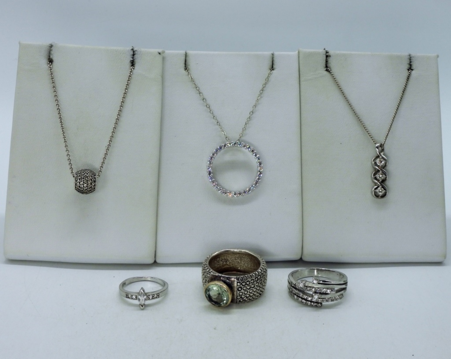 Bridal style, simulated diamond necklaces, 16-18″. Three sterling rings with simulated diamond gemstones, sizes 5 & 9. (16 dwt)