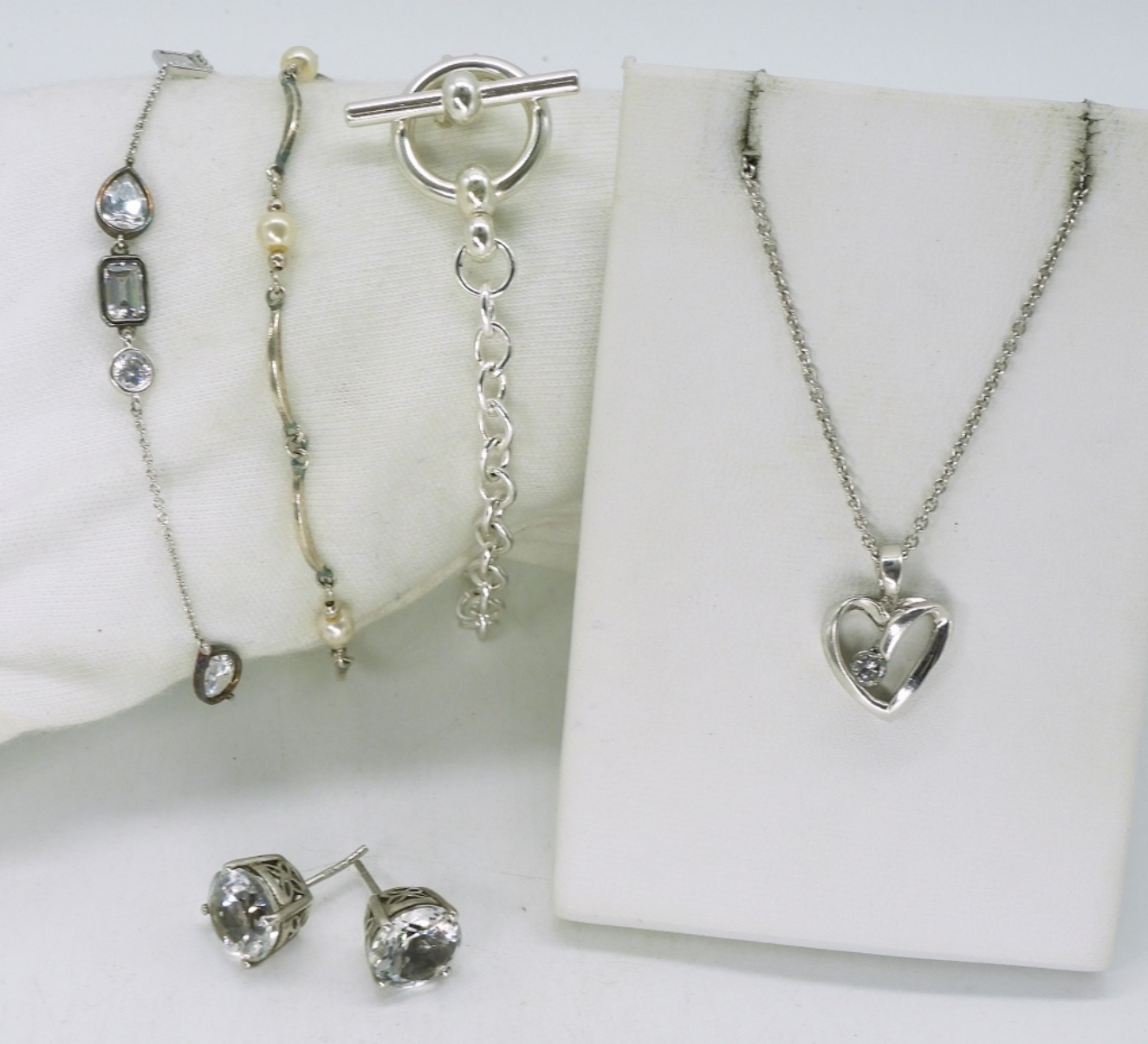 Diamond (tested) heart necklace, 18″. 3 sterling, petite bracelets. 7″. One pair of faux diamond stud earrings. (15 dwt)