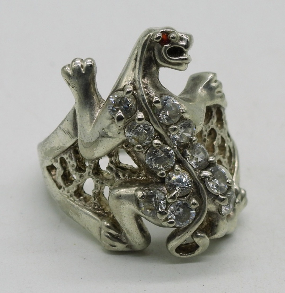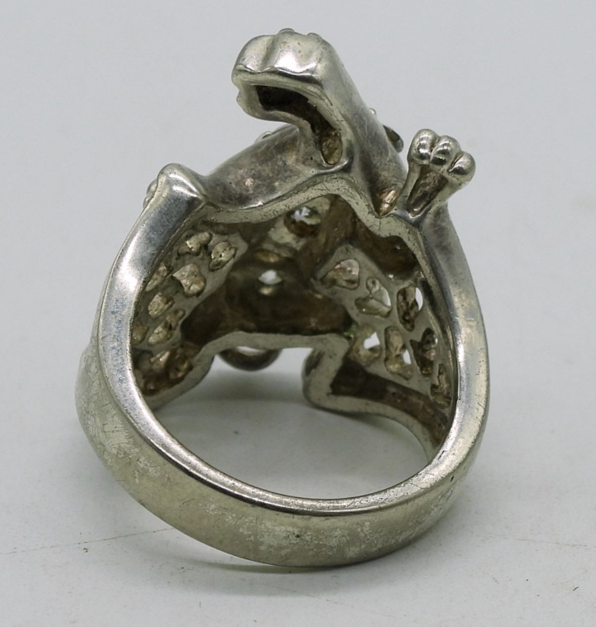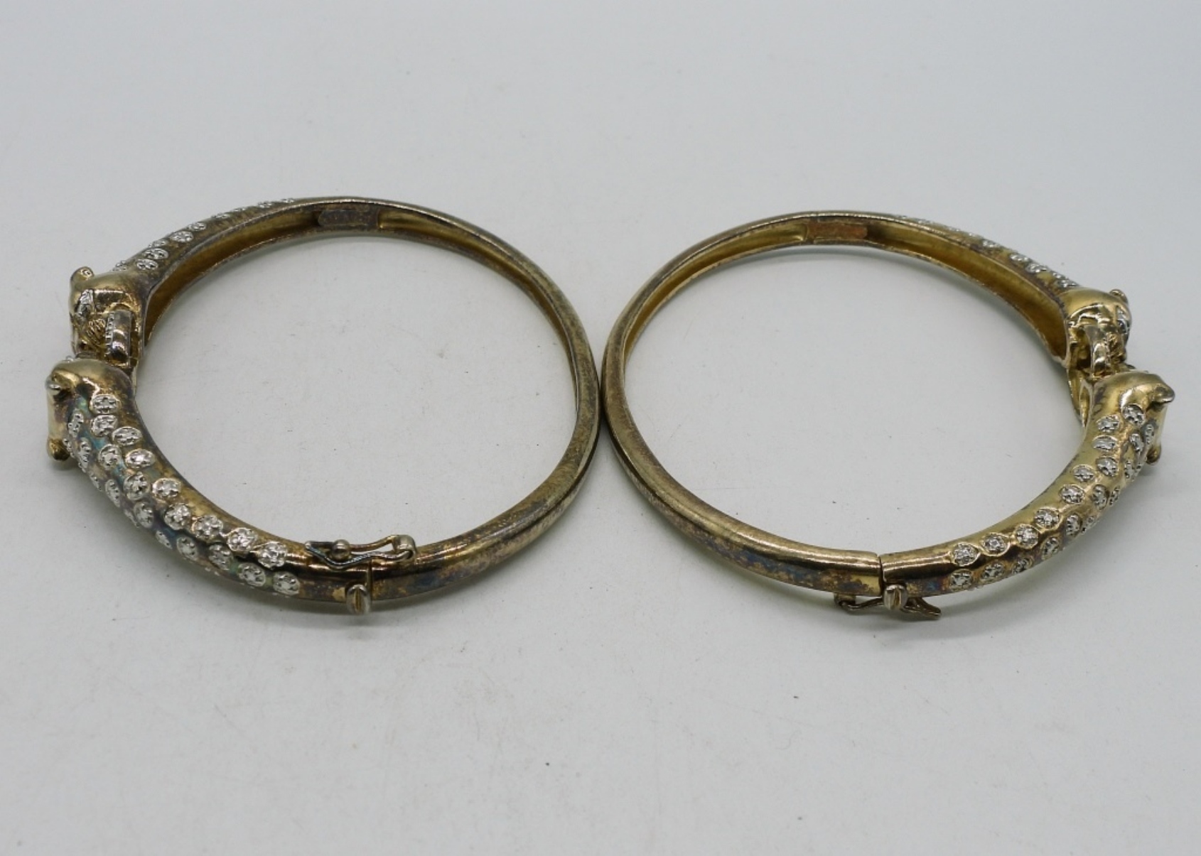 Two gold tone sterling jaguar bangle bracelets. Sterling jaguar ring with simulated diamonds, size 8. (37.4 dwt)