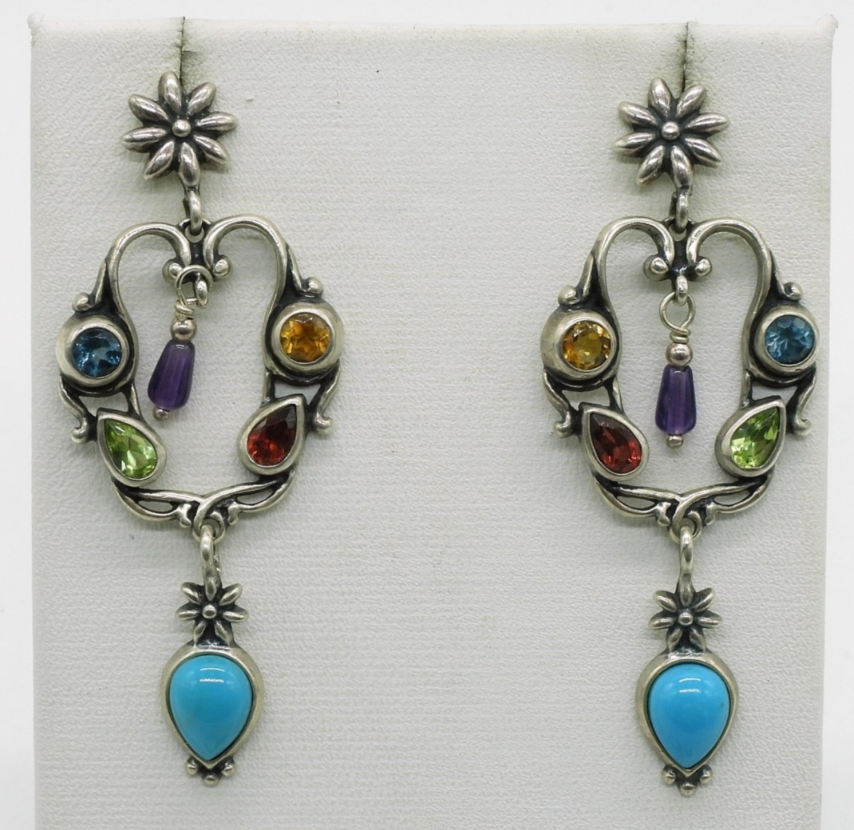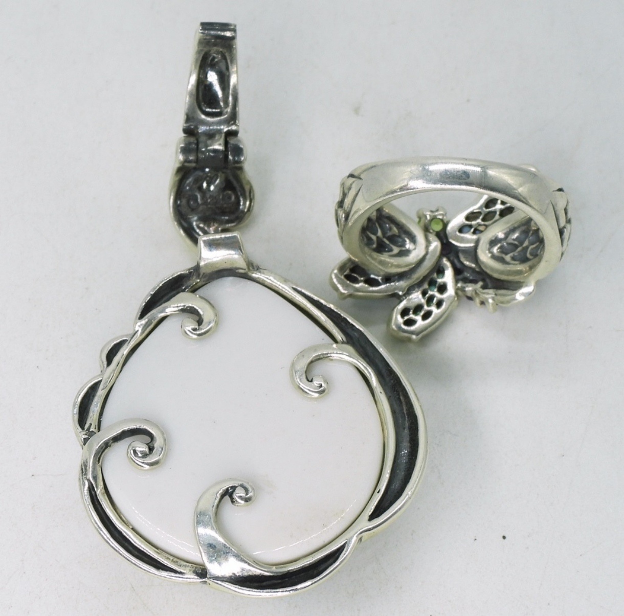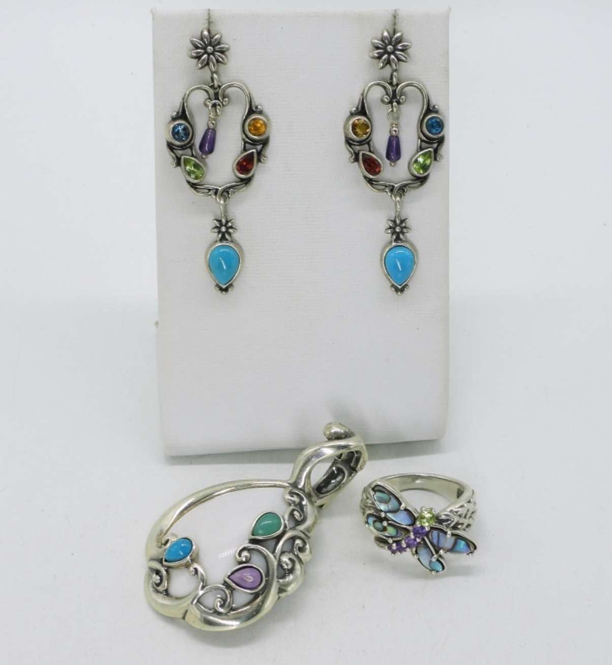 Carolyn Pollack pendant (2″ long), dragonfly ring with abalone (size 7) and one pair of sterling pierced gemstone earrings (2″ long). (24.6 dwt)