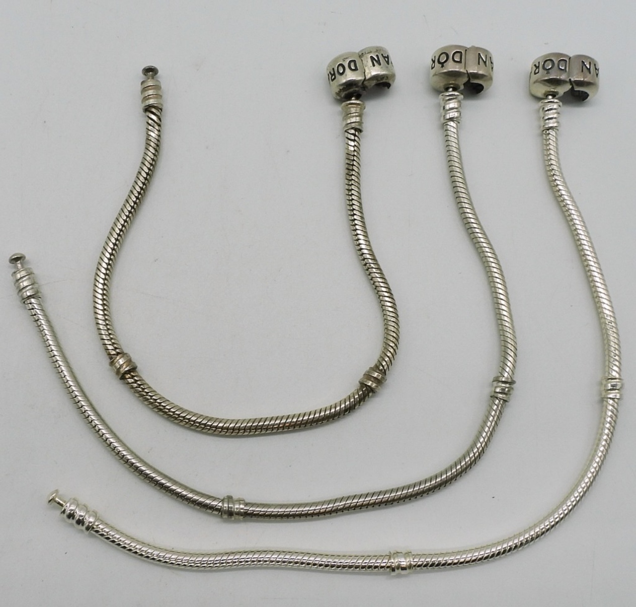 Three sterling Pandora charm bracelets, no charms. (27.5 dwt)