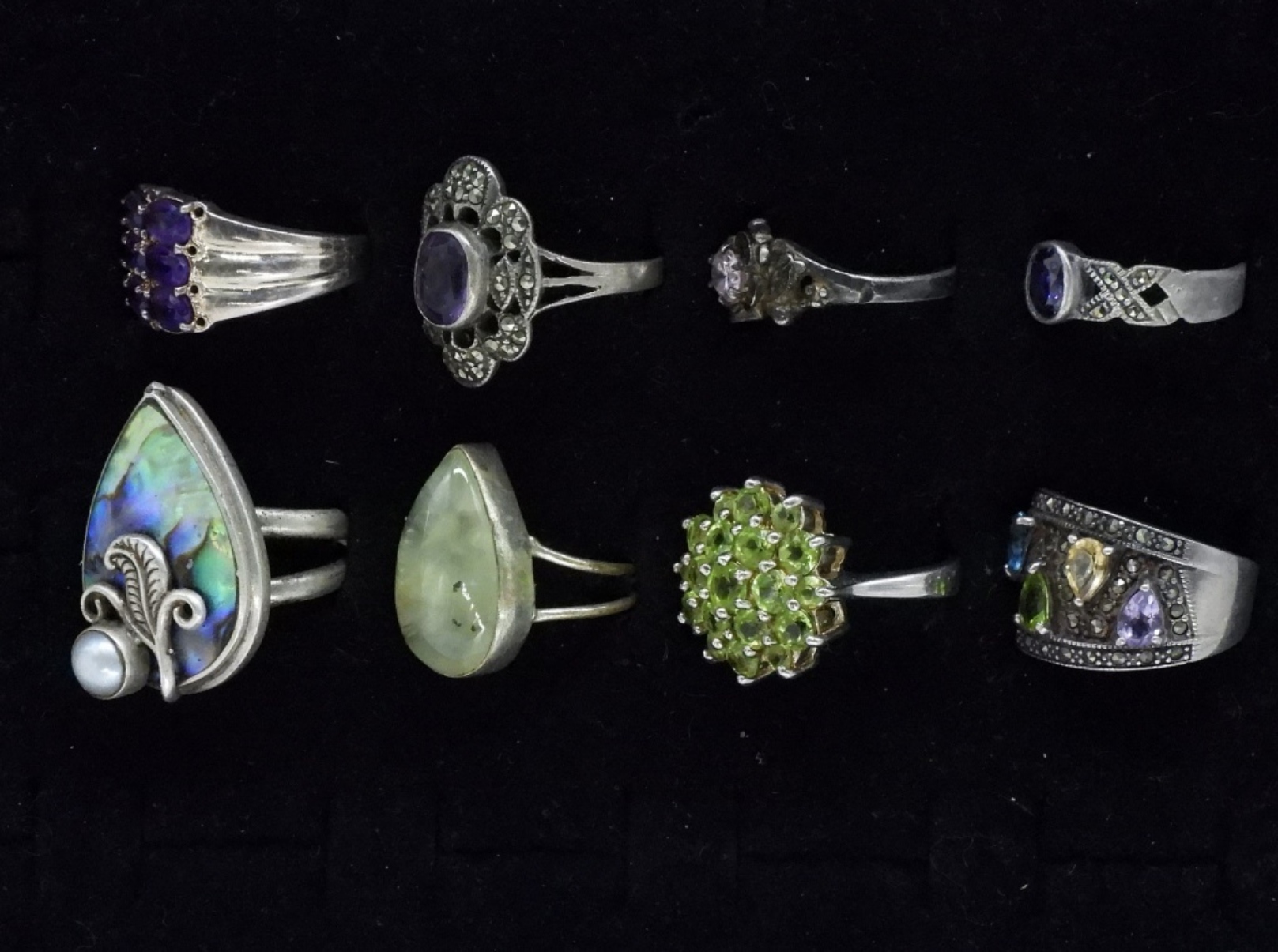 Eight sterling gemstone rings. Amethyst, Pink CZ, Peridot, Abalone. Sizes 7-9 (30 dwt)