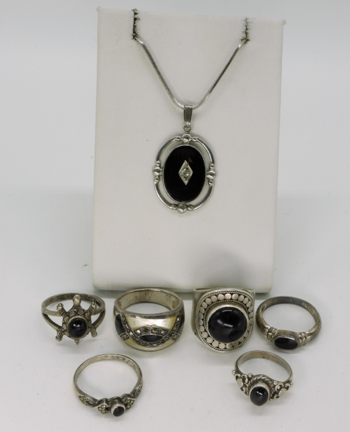 Six sterling black onyx rings, sizes 4-8. Vintage black onyx necklace, 18″. (20.8 dwt)