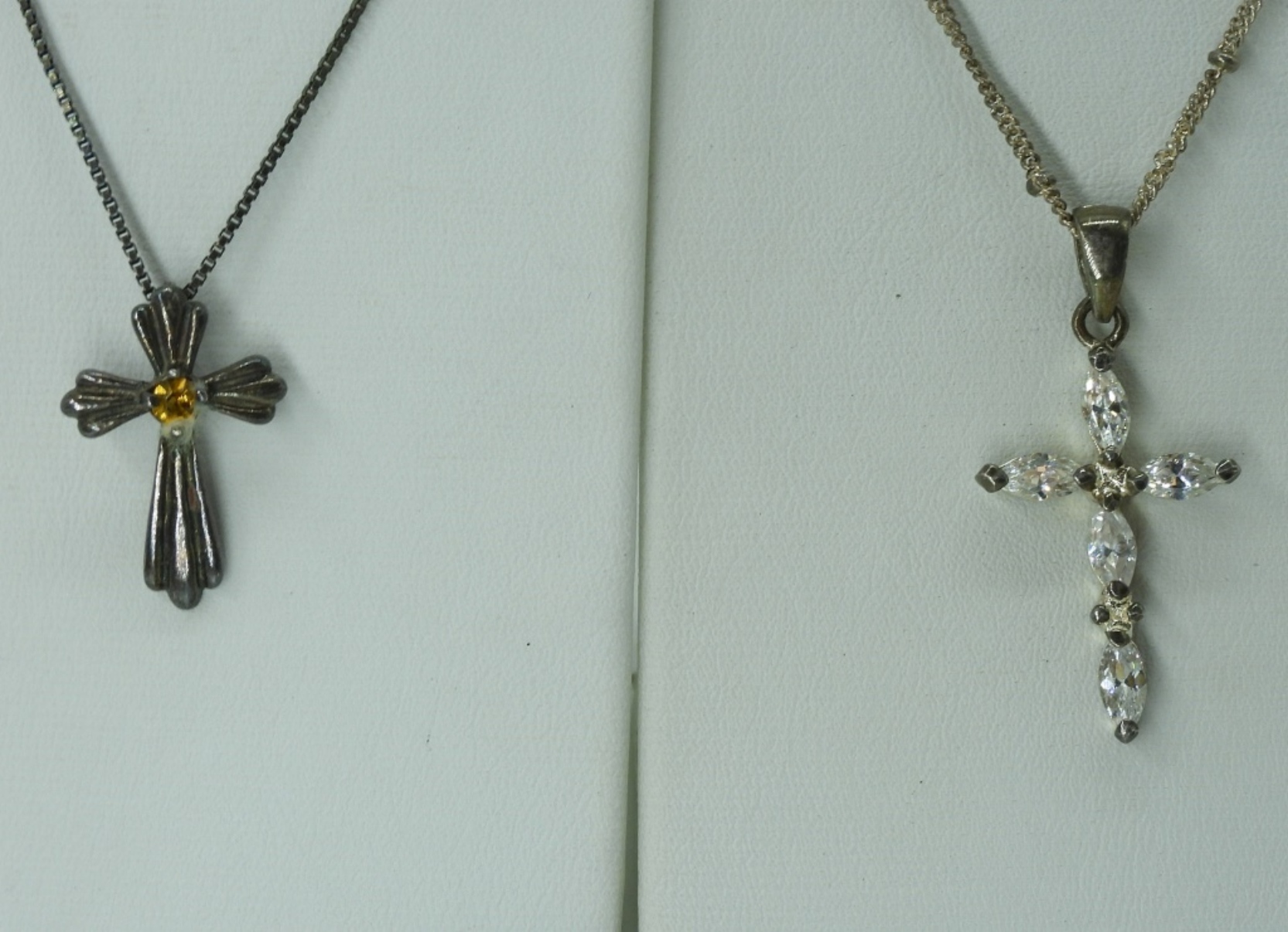 Four sterling cross pendants, two sterling chains 18″. Ring size 9. (10 dwt)
