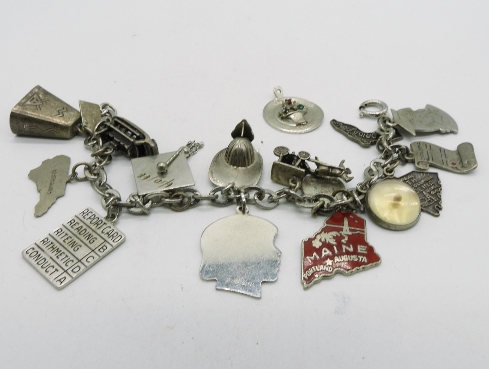 Vintage sterling charm bracelet with 16 charms. 7″ long. (25 dwt)